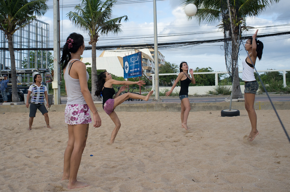 She who must be obeyed decides we are going for a cycle this evening, so we do. On Jomtien beach there is the usual gathering of ladyboys playing volleyball. I want to see whether the Fuji X100 can catch an action shot.
