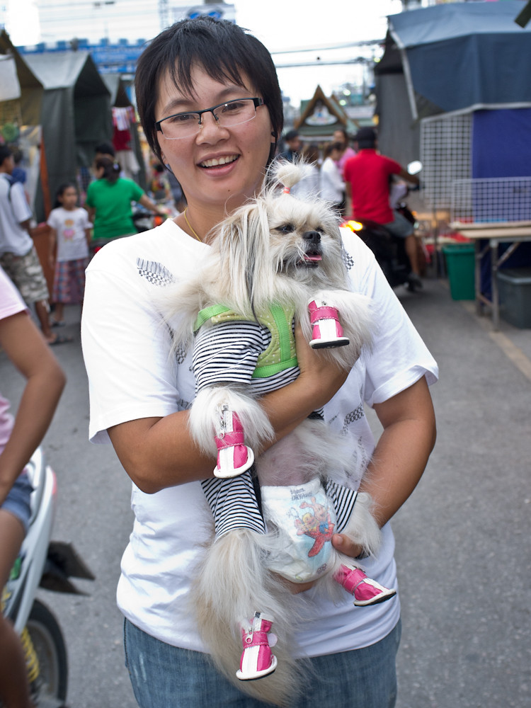 What I thought was: “This poor dog is being forced to wear shoes, clothes and even a nappy. You Madam, are fucking insane.”
