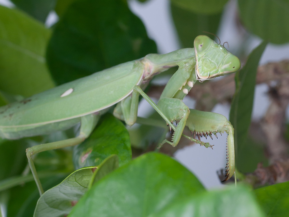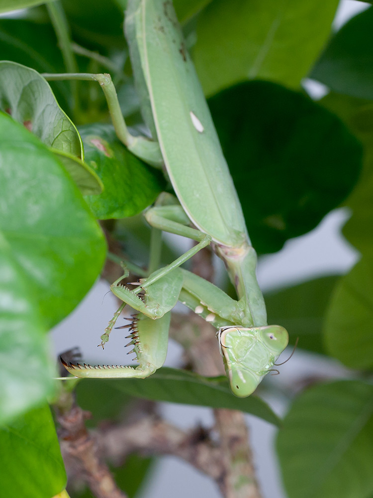 Next to set up a suitable area to photograph it without it flying away. High plastic walls surrounding a bush imported from the balcony would serve the purpose. While I was setting this up, the maid was fretting about the condition of the mantis which was in an airtight container. “It will have no air to breathe Khun Spike” she nagged, while I silently calculated that there was enough air in the container to keep the beast breathing for at least a week. Other than her inability to calculate insect oxygen requirements, I didn’t understand why she is fretting; she is happy enough to eat her own weight in fried insects given the opportunity.