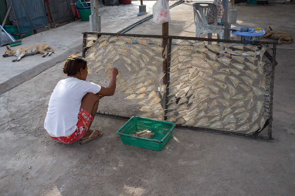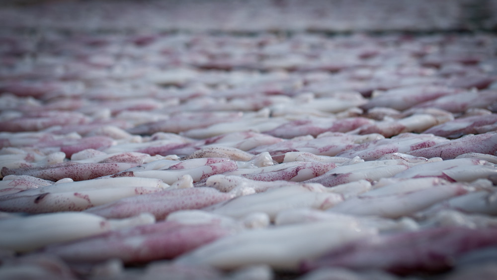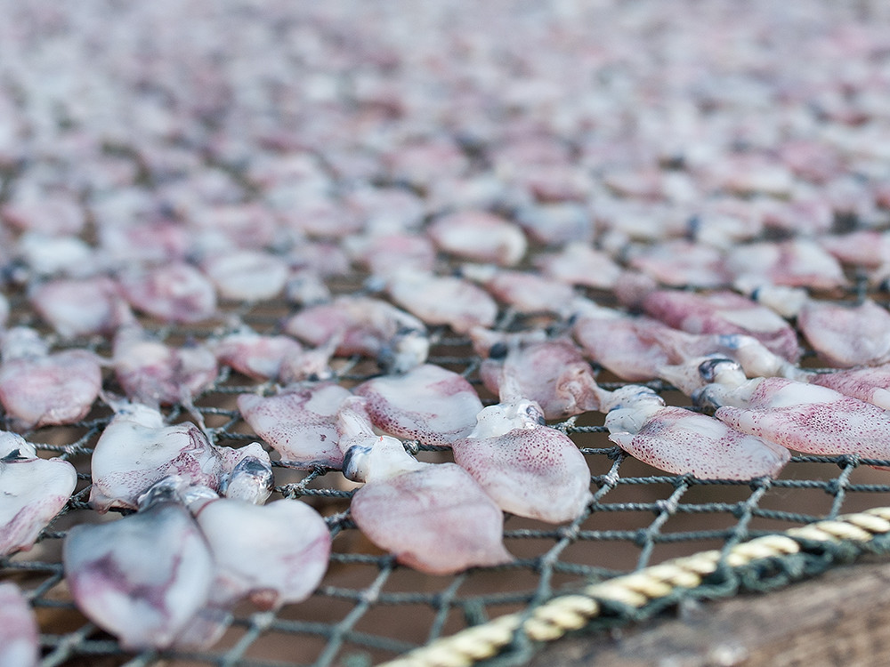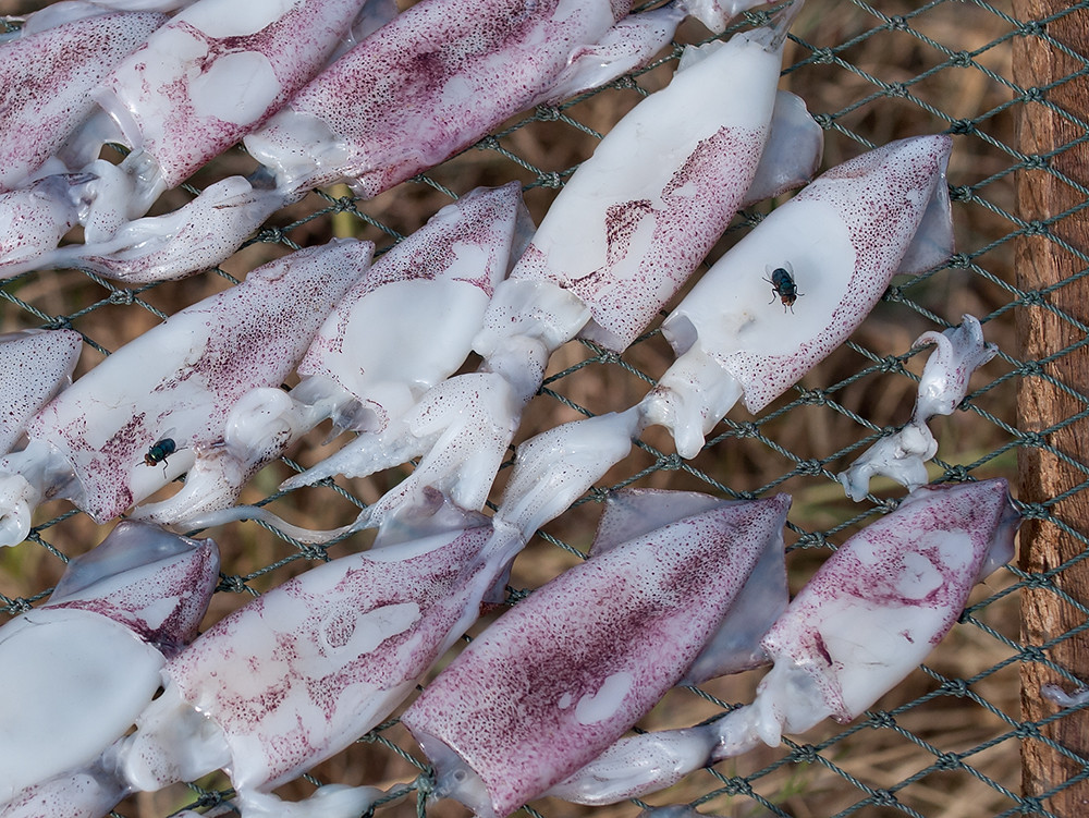 The squid and fish spend a whole day being dried by the sun and being tenderised by fly feet; before being hauled off the frame and sold as a tasty snack.