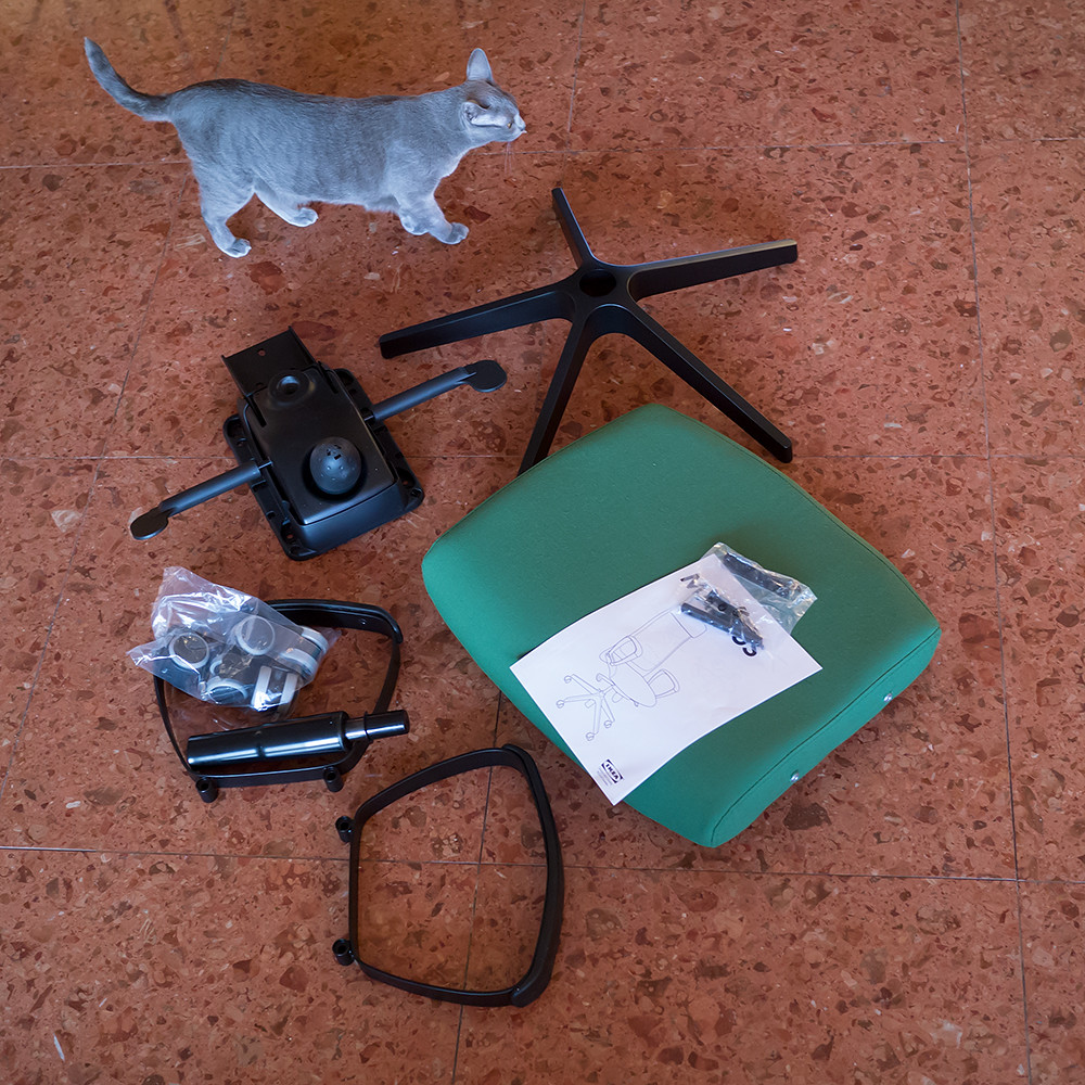 Back home and some of the bits of the chair are laid on the floor for inspection by the cats.