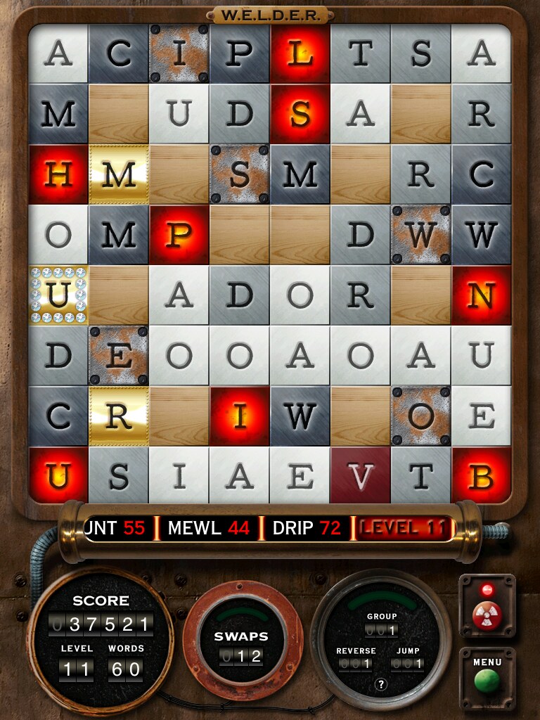 Welder is addictive fun and good for the brain. Available for iPhone and iPad, although you will press the wrong letter on the iPhone occasionally, especially if you are driving at the time.