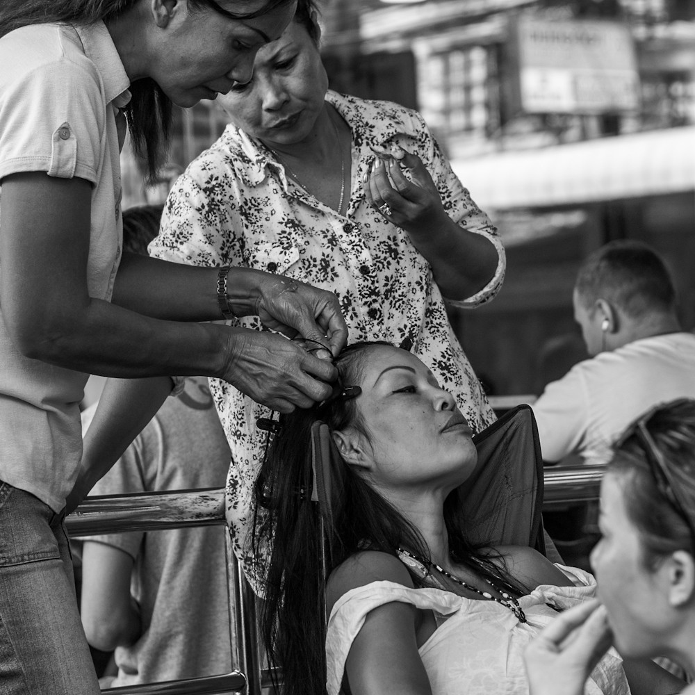 You could go to a salon to get your hair done; or you could save a load of cash by having your friend attend to your needs out on the street, while other friends eat snacks and provide criticism.