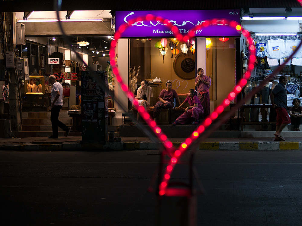 City Hall erected some heart-shaped lights for Valentine’s Day. The view through one was of a massage parlour. I just had to wait for a couple of guys to walk past the place to get the shot I wanted.