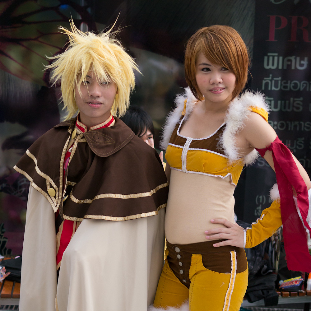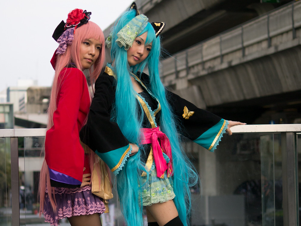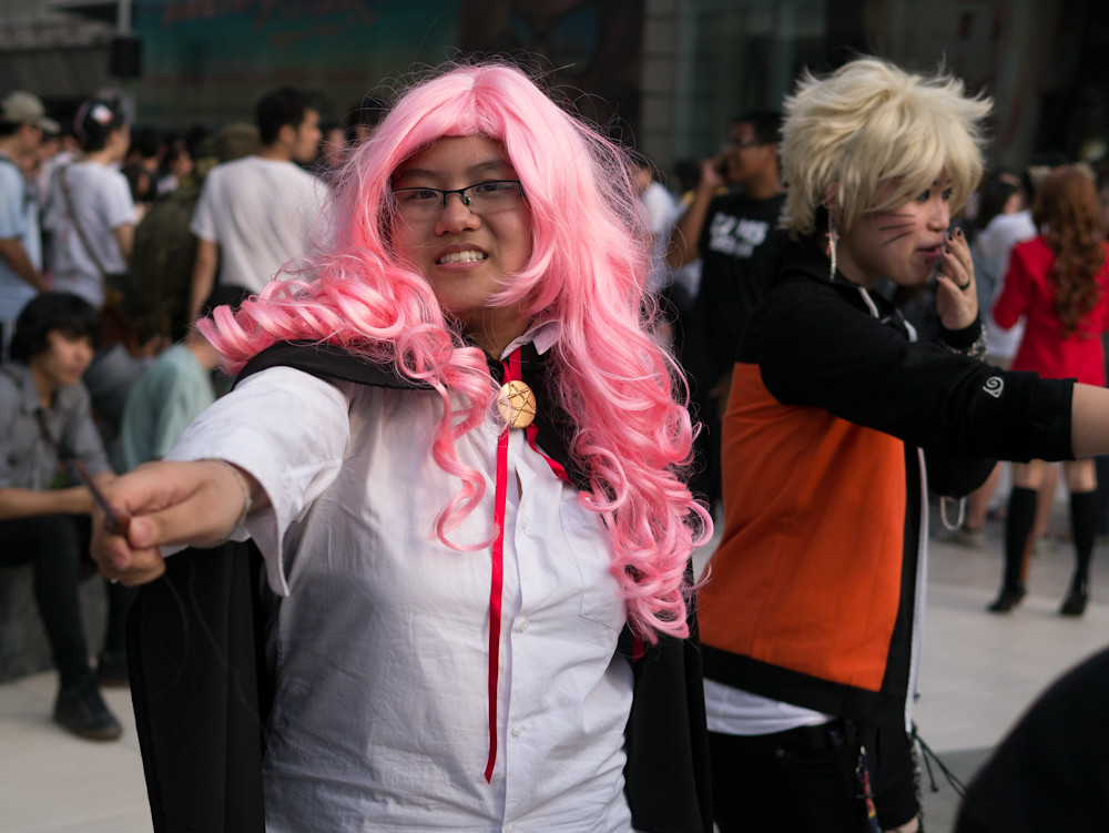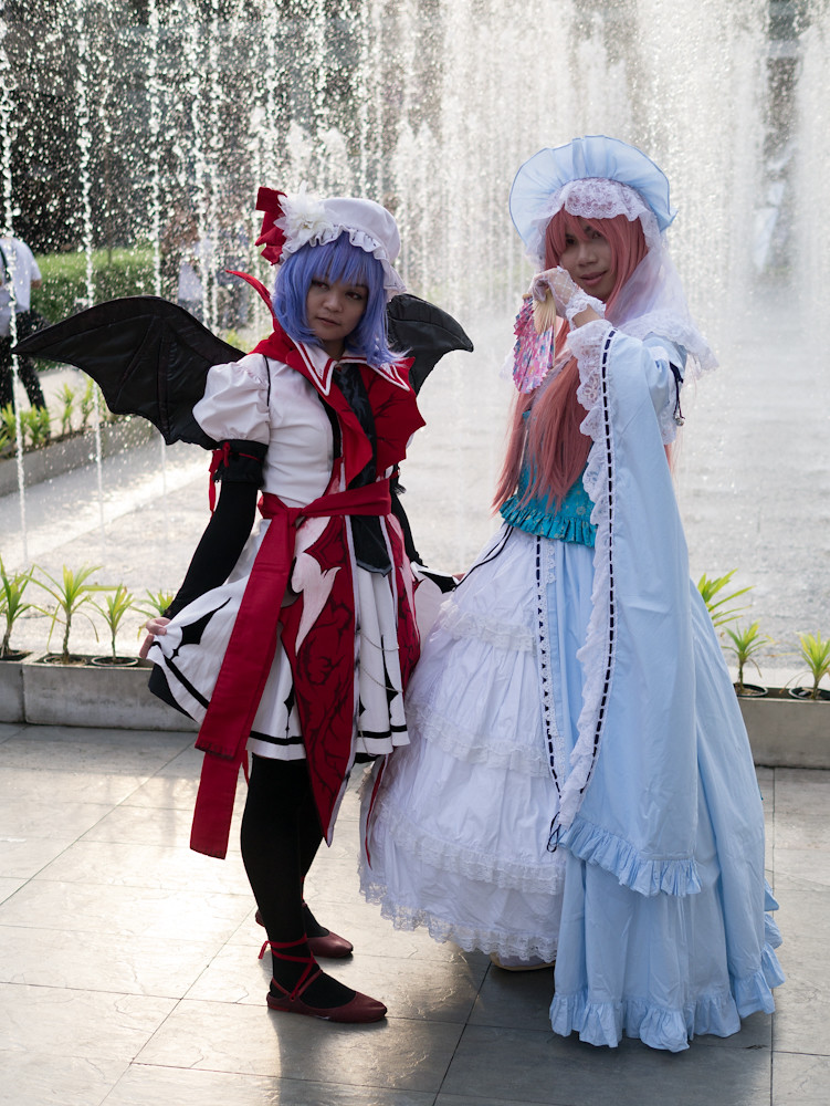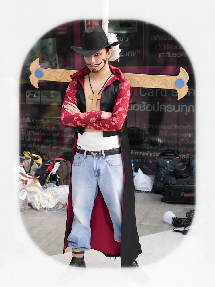 The cosplay convention was happening outside Paragon in Bangkok and I had fifteen minutes of shooting time before we had to meet someone for dinner. What a target-rich environment. Dozens of weird, or cute or, best of all, weird and cute students in outrageous costumes, just aching to be photographed. I could easily have spent an hour or more with them. Still, in fifteen minutes I caught a few, and here they are: