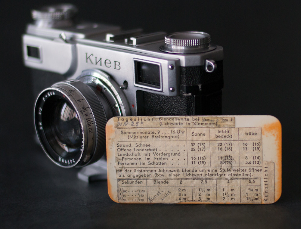 Given that this was a camera made in Kiev, and sold to me out of Ukraine, it would be fair to assume it had never been near Germany. The vendor told me that Russians kept exposure settings charts from a German film box to help them convert to Russian film settings. But that doesn’t explain the German handwriting on the front and the back of the card. A little mystery that will probably never be explained.