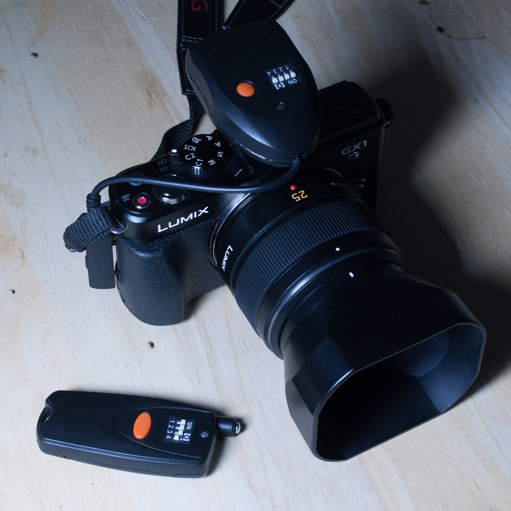A transmitter with an aerial in case you happen to be standing a long way away, and a receiver which dangles from the side of the camera, unless you modify like I did and add a hotshoe mount. Press the transmitter button half way down to focus and all the way down to take the shot; and it works perfectly.