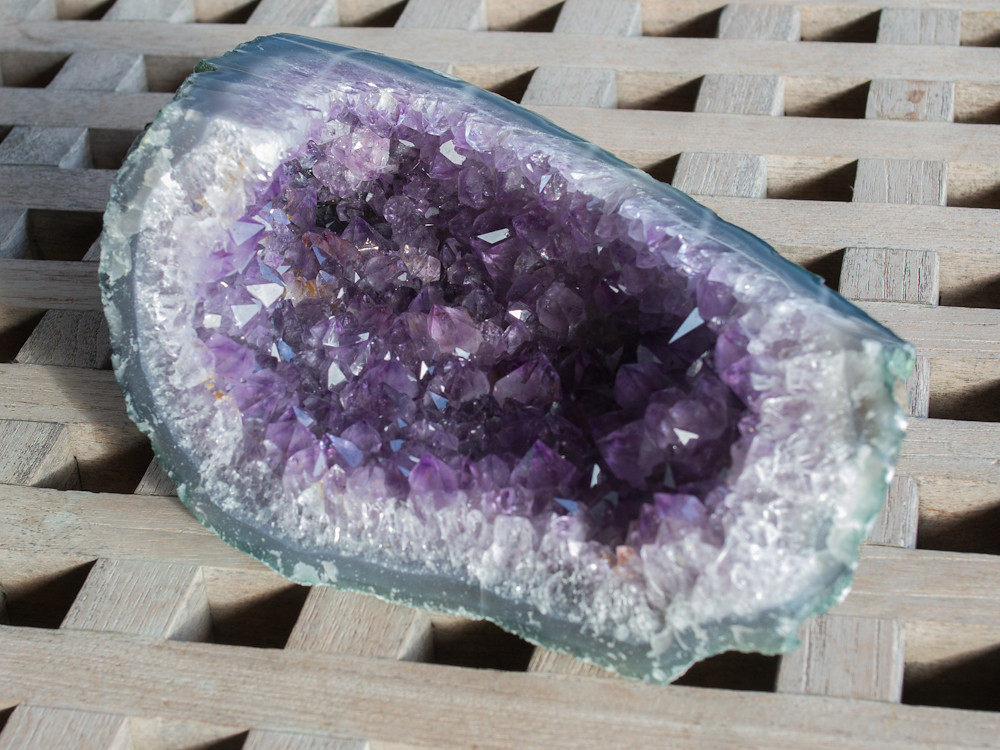 A very fine and chunky amethyst geode, stuffed full of crystals just waiting to reflect light back into the camera lens. You can see some doing it in the photo above, and a closer attempt has the same problem: