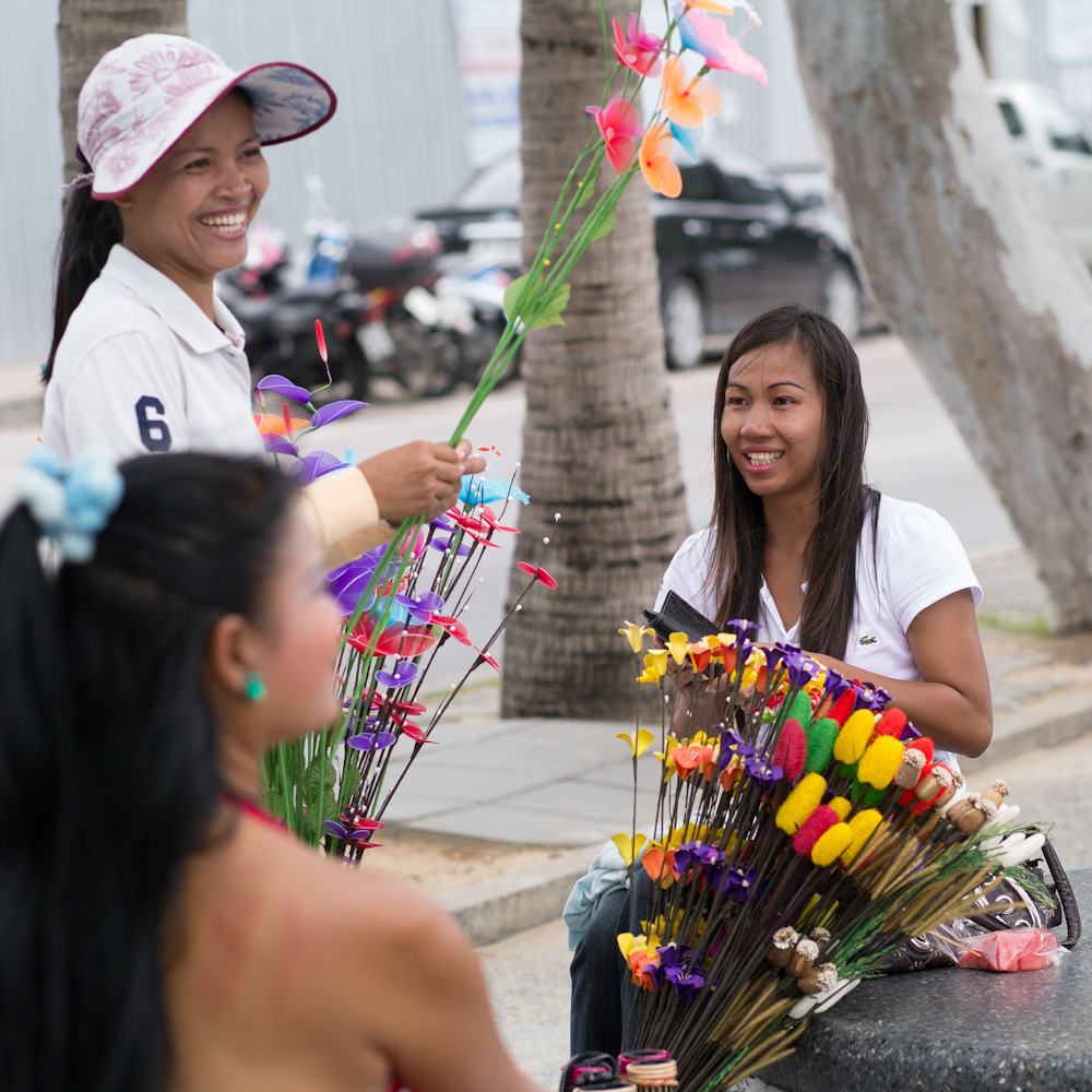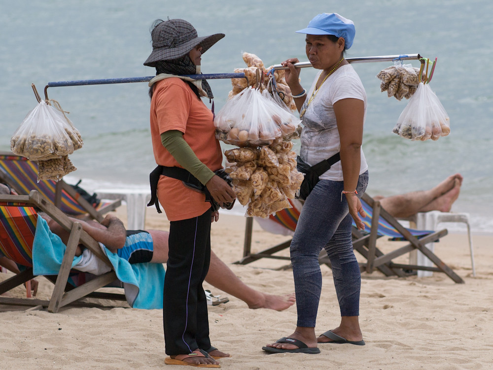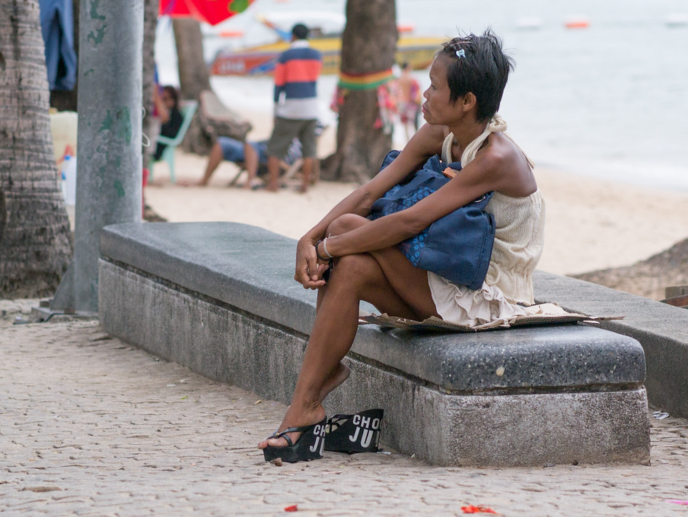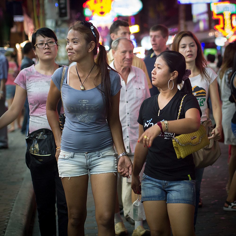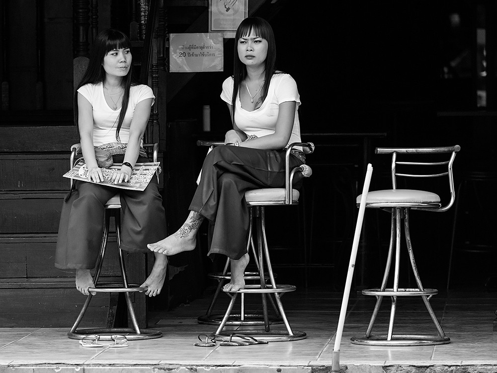 In general, the good-natured Thais don’t mind being photographed. It’s a tourist town and if you point a camera at a beach vendor they will either ignore you or give you a smile. But if you point a camera at a hooker or a pimp, or one of the less desirable characters that frequent the streets; then you could be heading for trouble and a reduction in the number of teeth. Less dangerous, but frustrating, point a camera at a Thai for a candid shot and, if they notice you, you will be rewarded by a huge grin and a V for Victory sign; not exactly what you were hoping to capture. Take the shot above. To me there is a little story you can construct about what the girls are thinking and who is missing from the third chair; all that would have dissolved if the subjects had seen and reacted to the camera.
