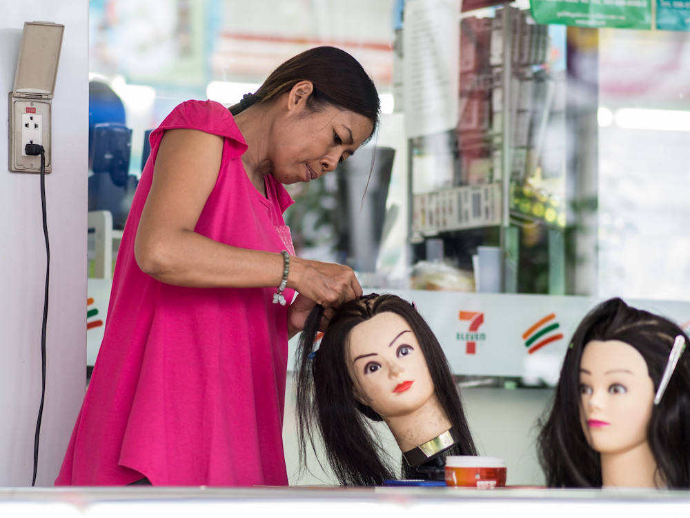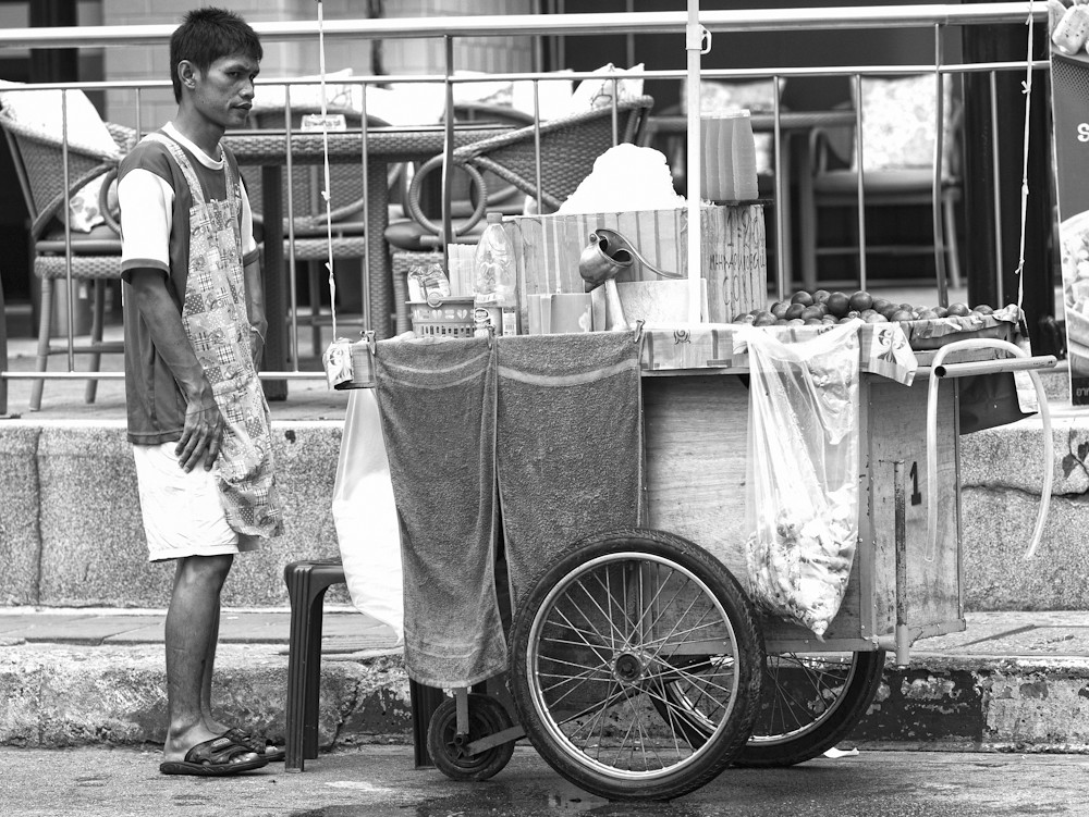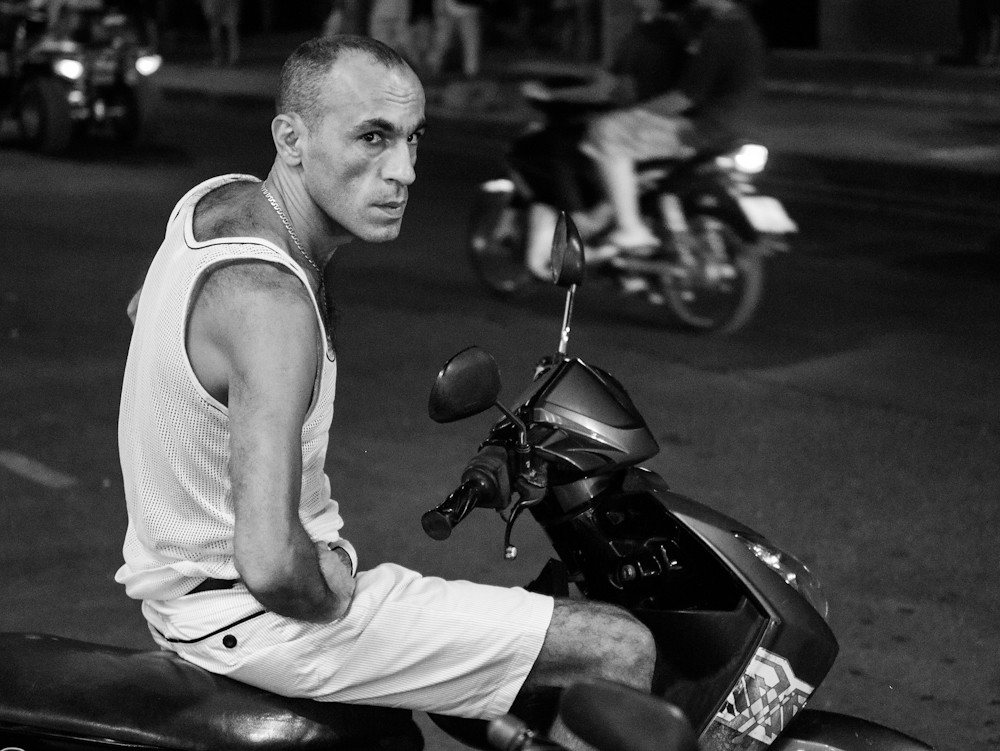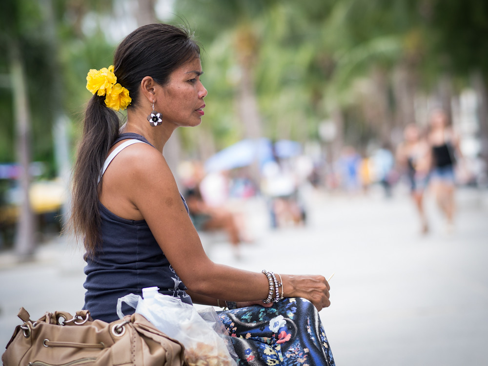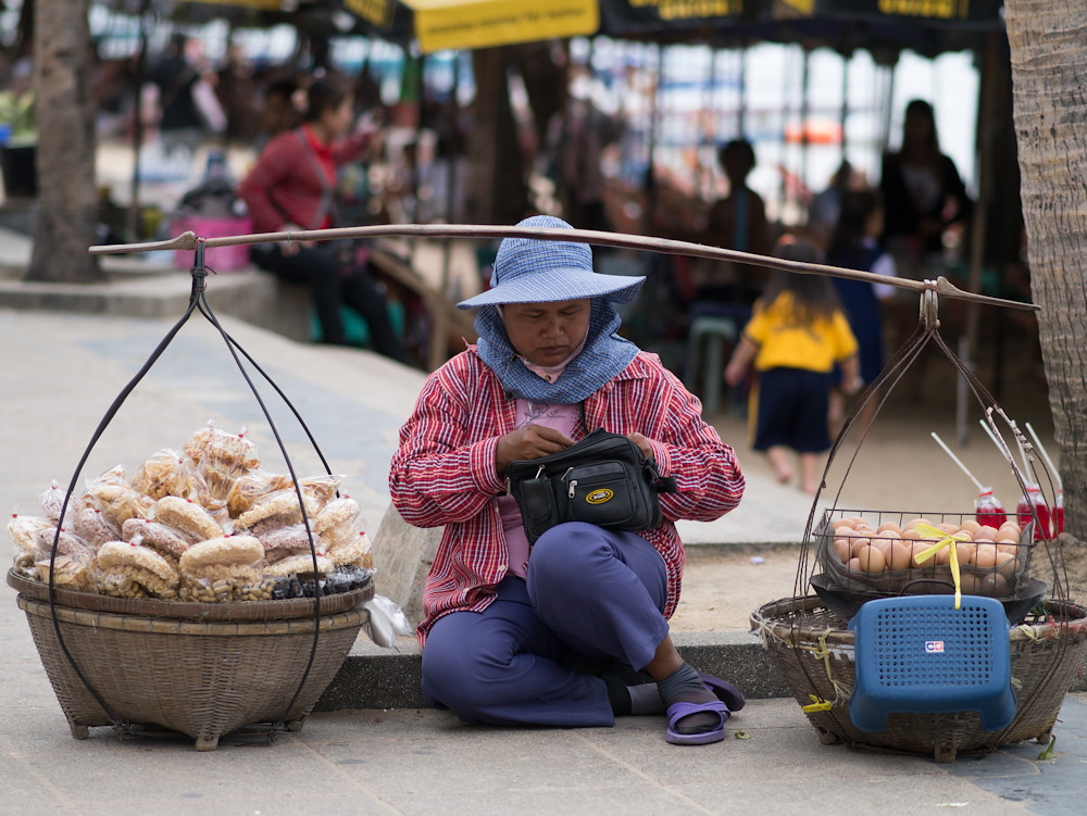 In general, the good-natured Thais don’t mind being photographed. It’s a tourist town and if you point a camera at a beach vendor they will either ignore you or give you a smile. But if you point a camera at a hooker or a pimp, or one of the less desirable characters that frequent the streets; then you could be heading for trouble and a reduction in the number of teeth. Less dangerous, but frustrating, point a camera at a Thai for a candid shot and, if they notice you, you will be rewarded by a huge grin and a V for Victory sign; not exactly what you were hoping to capture. Take the shot above. To me there is a little story you can construct about what the girls are thinking and who is missing from the third chair; all that would have dissolved if the subjects had seen and reacted to the camera.