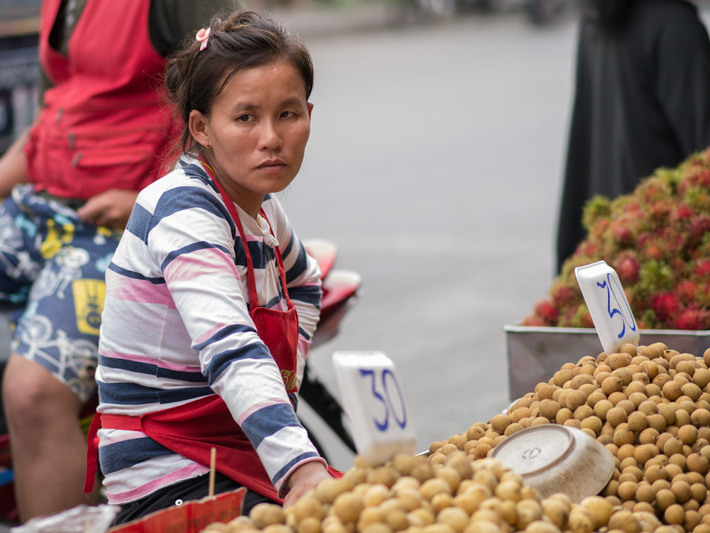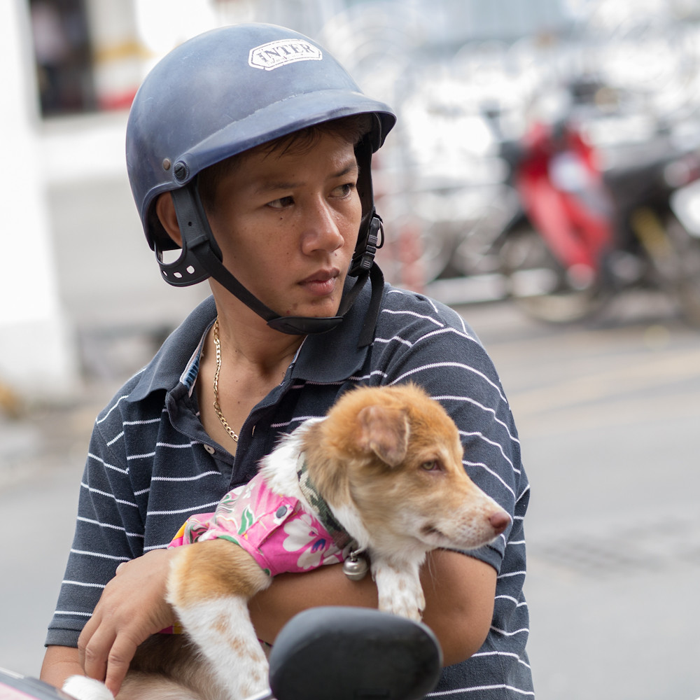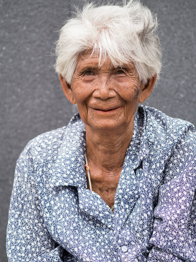 Out onto the street and I chance upon the charming old lady I met previously. She is pleased to see me, even more pleased when I make a donation, and I take her photo at F1.8. Reviewing the shot later confirms that, if you are close to your subject and using F1.8, your depth of field is going to be very small. Her blouse is in and out of focus which is disconcerting, and I would have liked her cheeks in focus as well as her eyes. Will have to go back; give her some more baht, and take her photo again. But apart from that; impressive IQ at F1.8 (no additional sharpening).