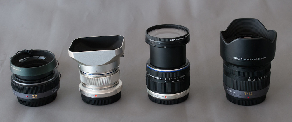 This makes it look larger than the other lenses, so here they all are with hoods attached; apart from the 9-18mm which doesn’t have one, so I have extended the lens instead (and yes, the ridiculously expensive 12mm optional hood has not been put on straight):