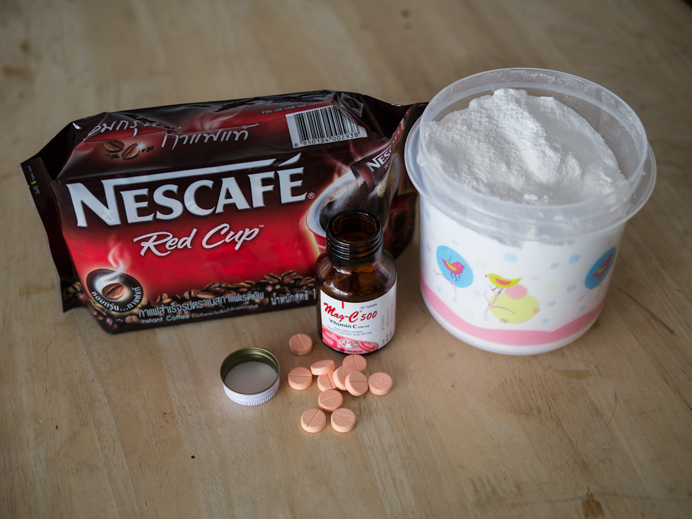 2012-09-14| Timo saysI faced the same problem getting hold of these ingredients in Bangkok. I also went for ground vitamin c pills, they work great. For the washing soda, I used ordinary baking soda (which you can get at Tops), put it into a hot pan and heat it - becoming washing soda in the process. I have a bunch of my caffenol-developed fotos on my flickr account: http://www.flickr.com/photos/timokl/sets/72157626787903058/