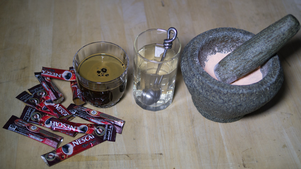 It took ten sachets of Nescafe to provide the required amount of coffee. These were mixed into a small glass of water and the resulting aroma is what you might expect a glass of cold Nescafe at ten times normal strength might smell like. The washing soda was also mixed with water, and twenty eight Vitamin C pills were pounded to dust.