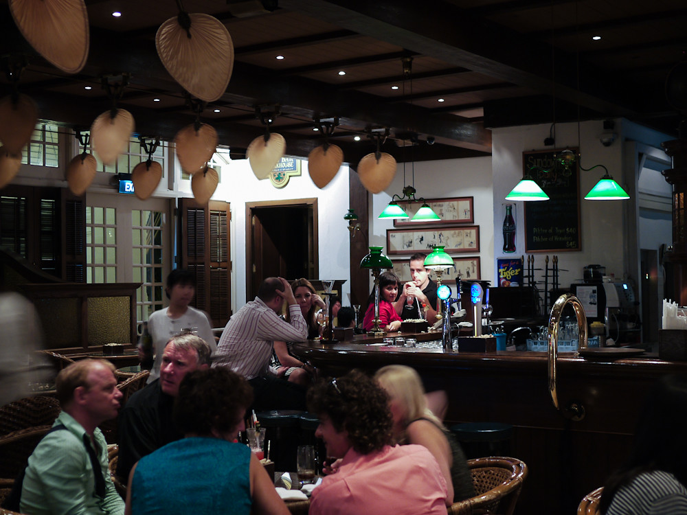 I found mine in Singapore on the 15th December 2009. I believe I had sold the trip to she who must be obeyed on the basis of “seeing the lights”; but once there I dumped her in a shoe shop and scoured the island for a GF1 kit with both lenses. Found it in the afternoon and spent a couple of frustrating hours dodging the pouring rain trying to get shots, before repairing to the Long Bar at Raffles for free peanuts, expensive drinks and a chance to take a photo.