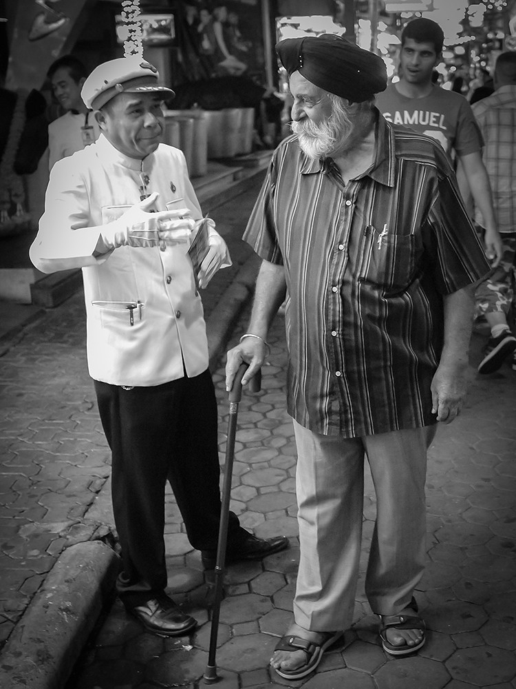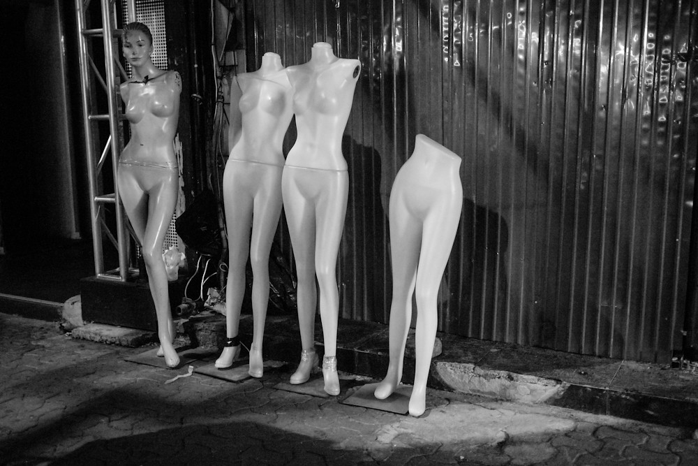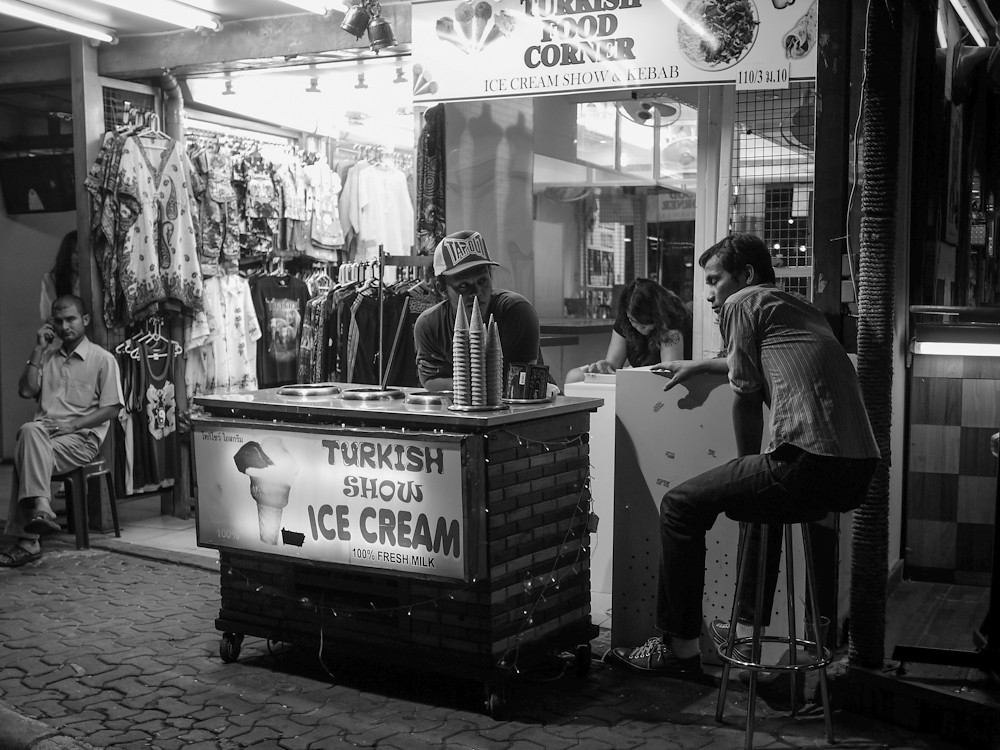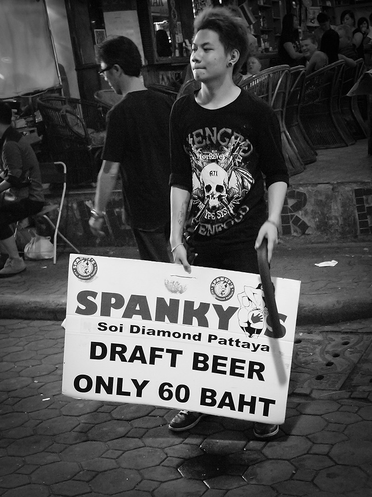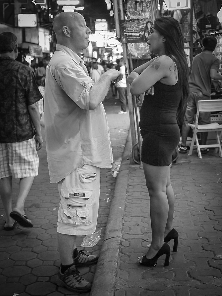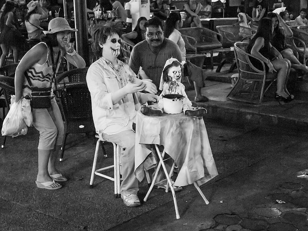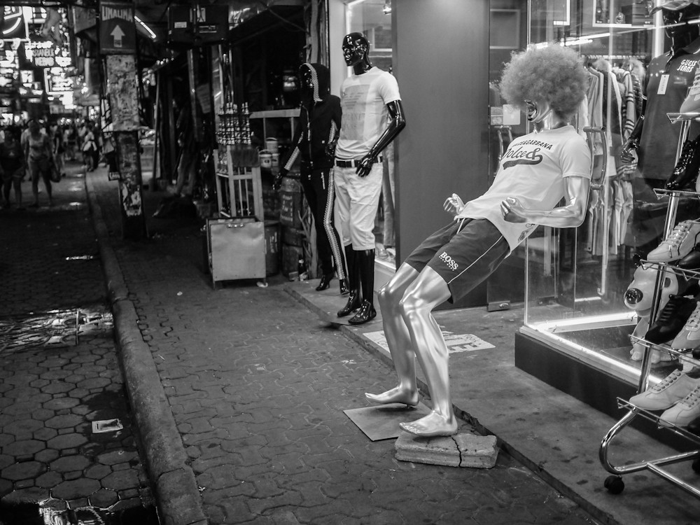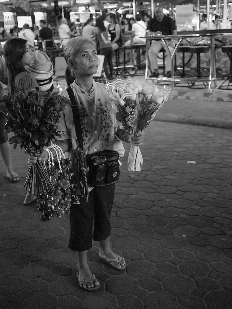 I decided to call upon its services last night, and give it an outing to mark the anniversary of the unveiling of this remarkable little camera. I took the GF1 without the added viewfinder, because that is all I had when I bought it, with the 20mm on the front. I went to Walking Street at night, shooting Dynamic Black and White JPEG files at ISOs up to 1600. I also shot RAW, so I could use colour if I felt the need. In slightly over half an hour, I came back with these: