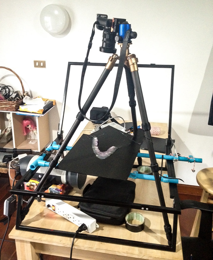 I always do what my son suggests, so this afternoon I set out to get a “crystals only” shot. This involved a long session with a pair of scissors, black tape and black plastic; to isolate the crystals from the rest of the geode. Then I needed to set the geode so I could shine a light in from the side, so out came the blue pipe again. Then I realised I had to photograph the thing from above, which required some delicate tripod manipulation. Finally, everything was set up and off we went to take some photos.
