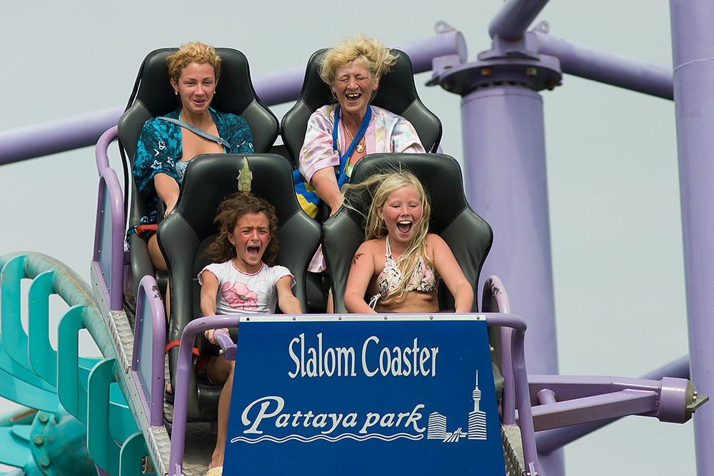 The composition and the shutter speed give no sense of height or velocity; but that somehow makes the ladies faces more prominent. Fun photo, not deleted.