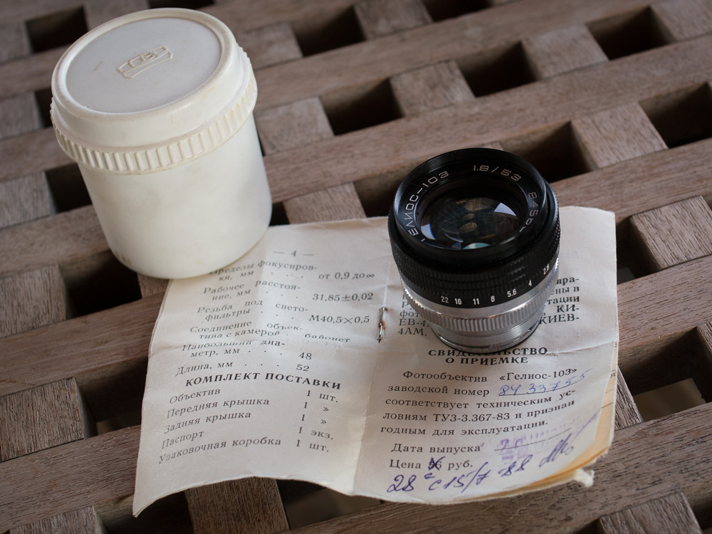 The Helios was produced between 1978 and 1984 and was shipped with Kiev rangefinder cameras. Problem was that the quality control on the cameras reached such a low point that entire production runs were sent for scrap, to reappear later as wheelbarrows. So by 1984, the lenses that were being produced had no associated camera, and hundreds (thousands?) of Helios 103 lenses ended up in a warehouse, unloved and forgotten.