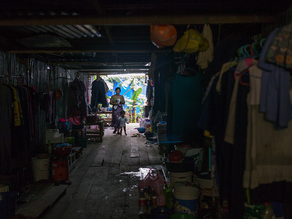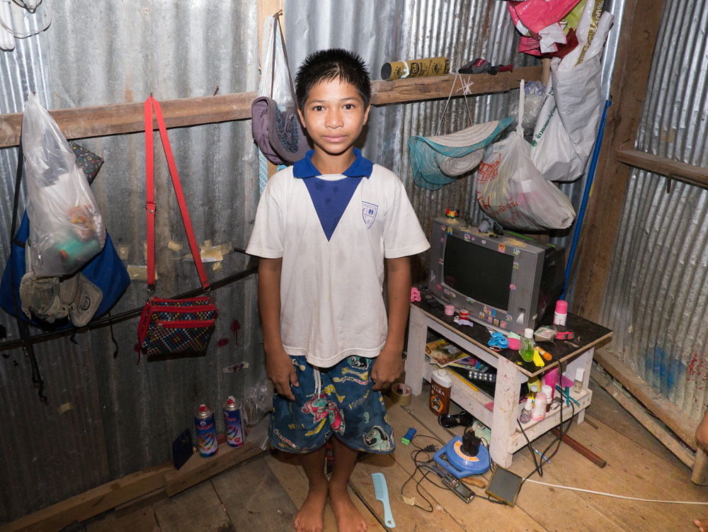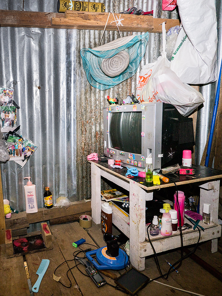 But the reality is that most of them are left to tend for themselves, stuck in their tiny tin boxes, while their parents are out working on the construction site. This little guy showed me where he has to spend his day alone, with nothing for company except a fizzing television: