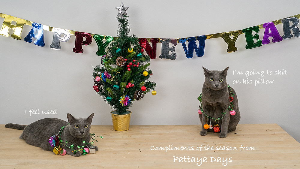*Credits: Reluctant performers: Tiki and Gabrielle Props: 300 baht’s worth of crap Chinese-made festive decorations. Cat wrangler: She who must be obeyed