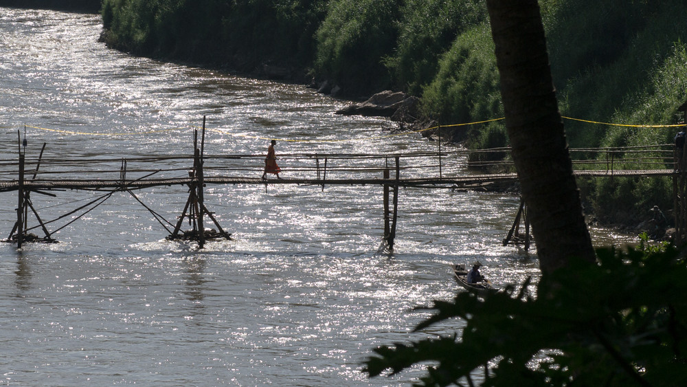 No blaring music and very few people; mainly tourists like us wandering around. In the area around the museum there are more restaurants and a night market and so it becomes busier in the evening; but overall it is much more peaceful and less frenetic than Thailand. Our first outing was for a late lunch, and the restaurant we chose was on the edge of the Nam Khan river. They were busier than usual, two cooks in the kitchen had fallen out, and the overall result was that our food took a while to arrive. But when you are sat next to a river watching monks crossing a rickety bridge, sipping on a coconut lime shake and watching the world go by on bicycles; it really didn’t seem to matter how long we had to wait.