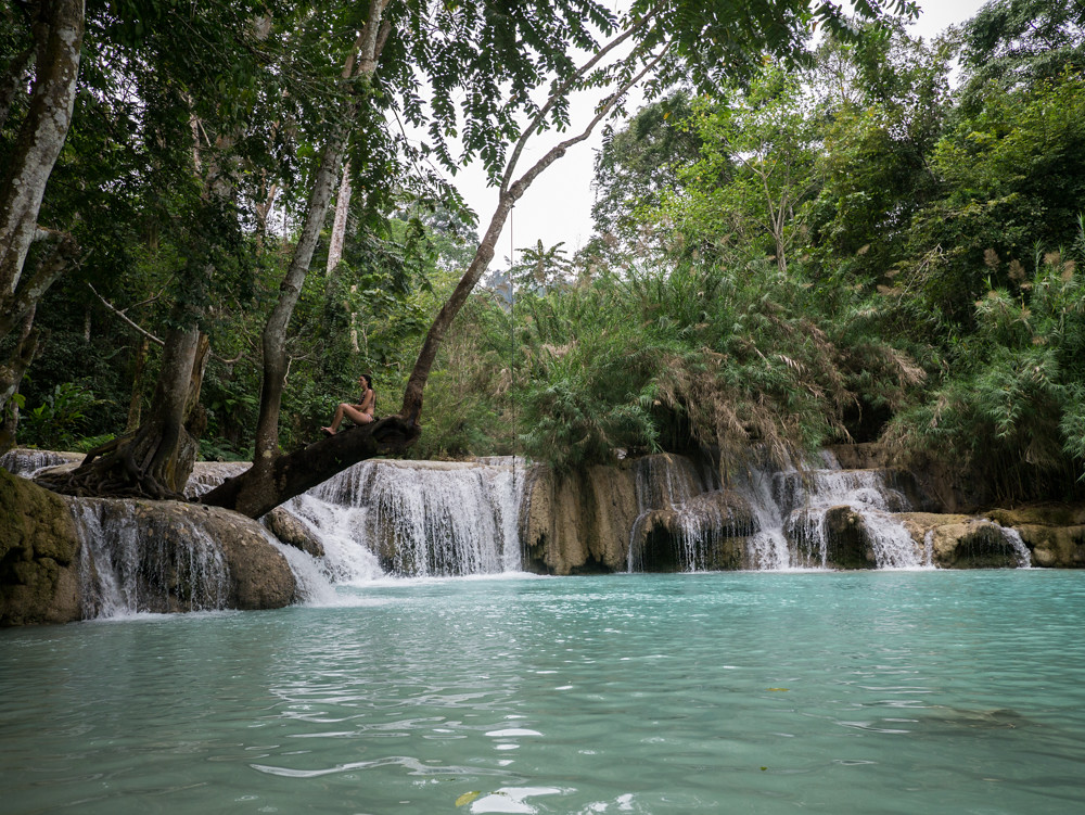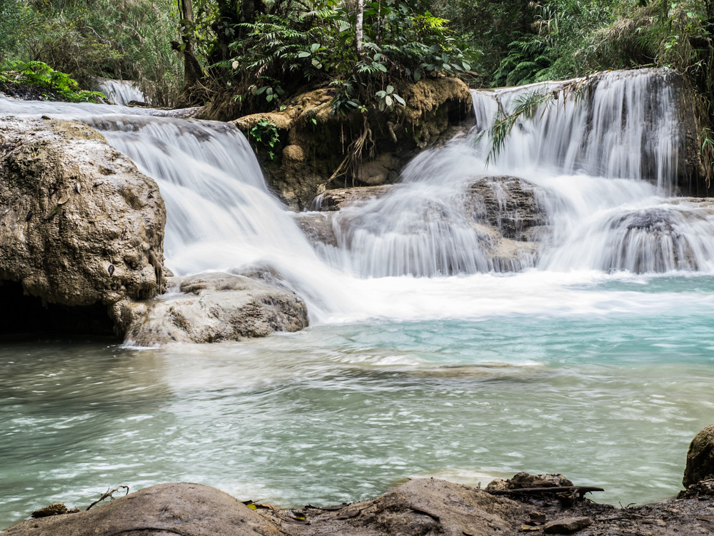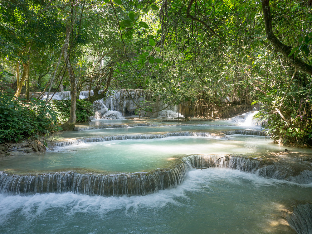 Our last weekend away to Koh Samet had to include a waterfall trip, and that had been a rather dismal experience; so I was not that keen on wasting half a day to see another dribble on a hillside in Laos; but here we were in a van on the way to the Kuang Si waterfalls.