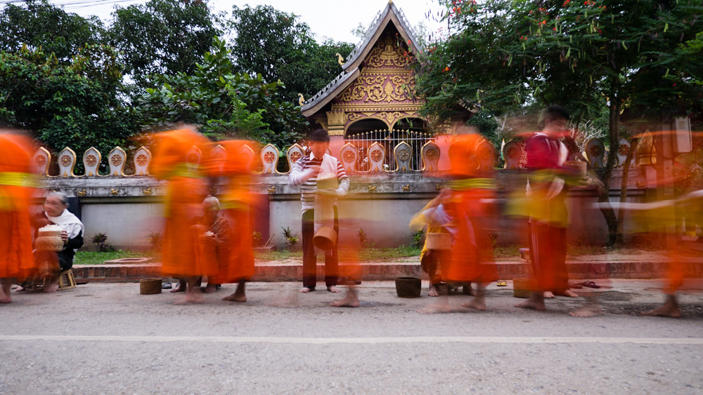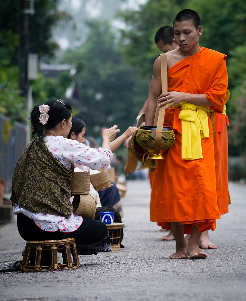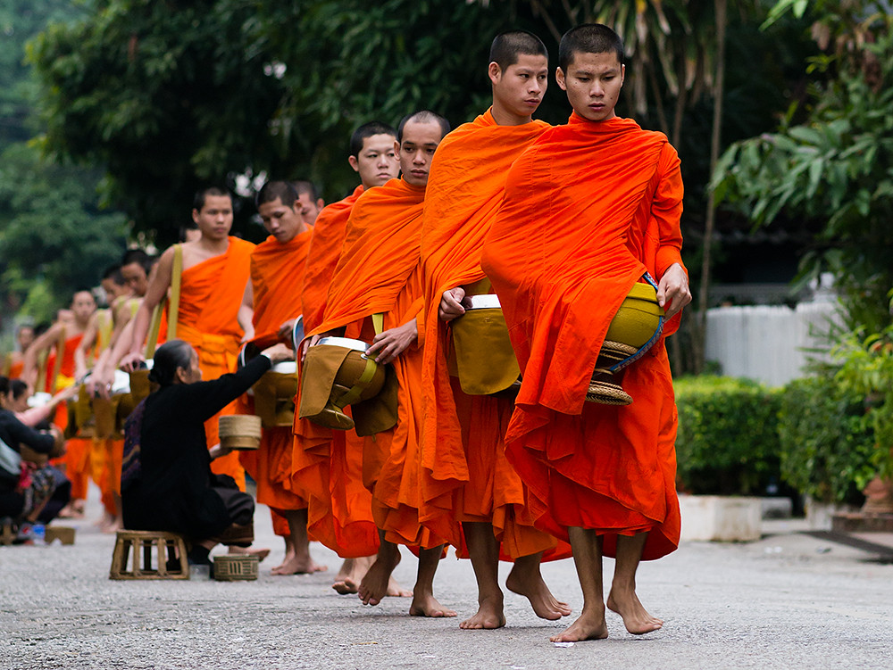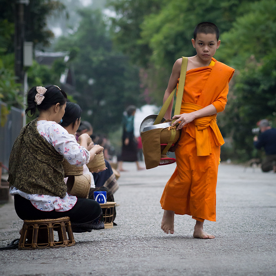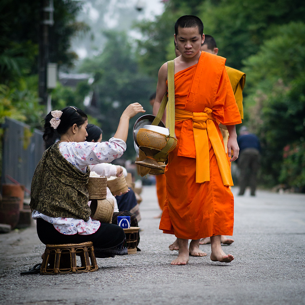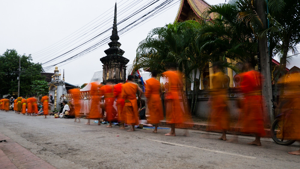 I am not an early riser so have rarely seen monks collecting alms on the streets of Thailand; but what I have seen has been a monk or two walking along a street collecting alms as they go. In Luang Prabang it is quite a different affair, with large numbers of monks walking in single file through the streets.