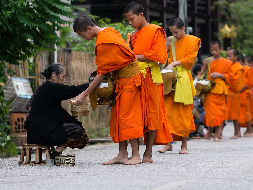 This old lady had her alms in a container, but left the lid of the container on the ground so she could receive some of her alms back from the monks: