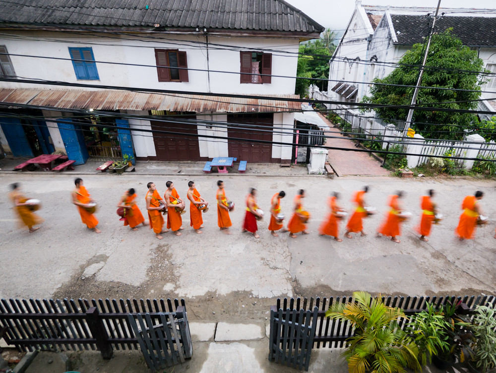 It’s an impressive sight, and the total silence apart from the swish of robes and occasional clink of a food container add to the experience. I made some slow shutter speed shots to give the impression of the monks drifting through the neighbourhood.