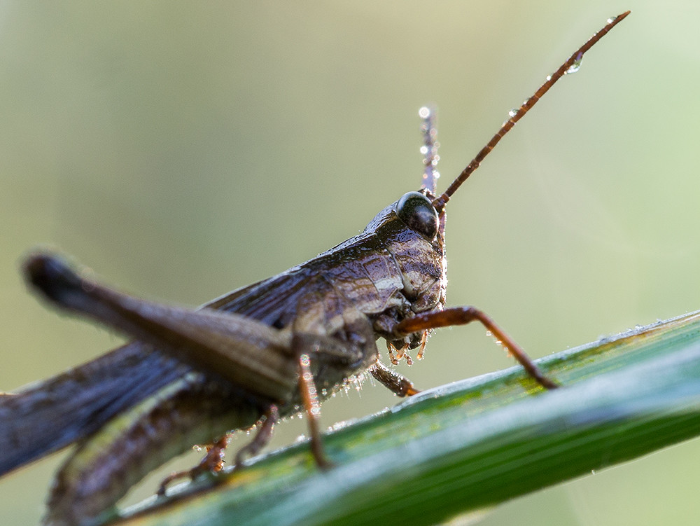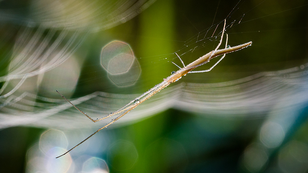 Perhaps a good time to go insect hunting? Thanks to the early morning sunlight, I discovered a large web wherein resided a strange looking spider. I could not work out which was the front, and the water drops on his body did not help in finding something I could identify as a face. Still, his cobweb in the background made for a pretty shot.