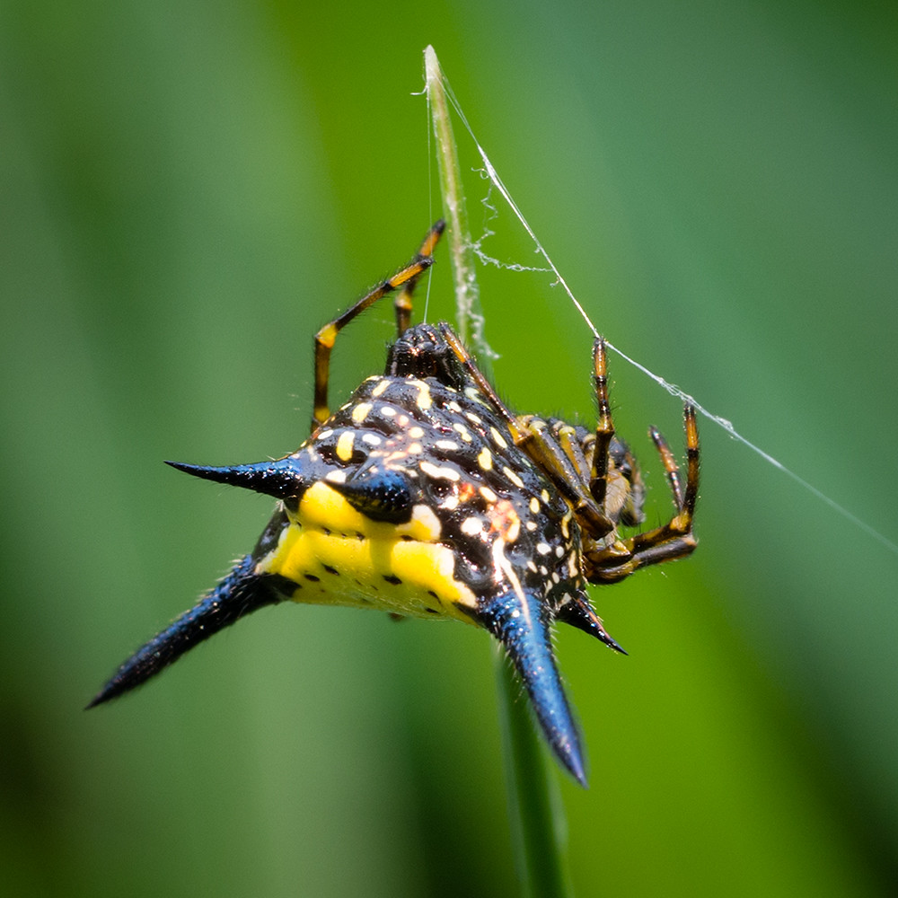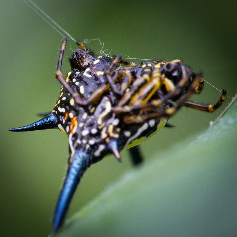 The object of my camera’s affections in the above shot was a spiky spider with a wild colour scheme and a body shape so convoluted it was impossible to work out where the eyes were located. It was also impossible to get a good shot. The spider was keen on spinning, the leaf it was on was blowing in the wind, and there was no clear point to choose to focus on. Better to look at in the wild than photograph.