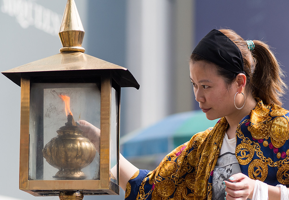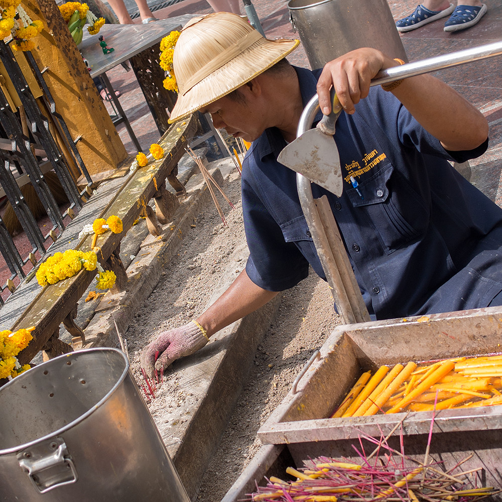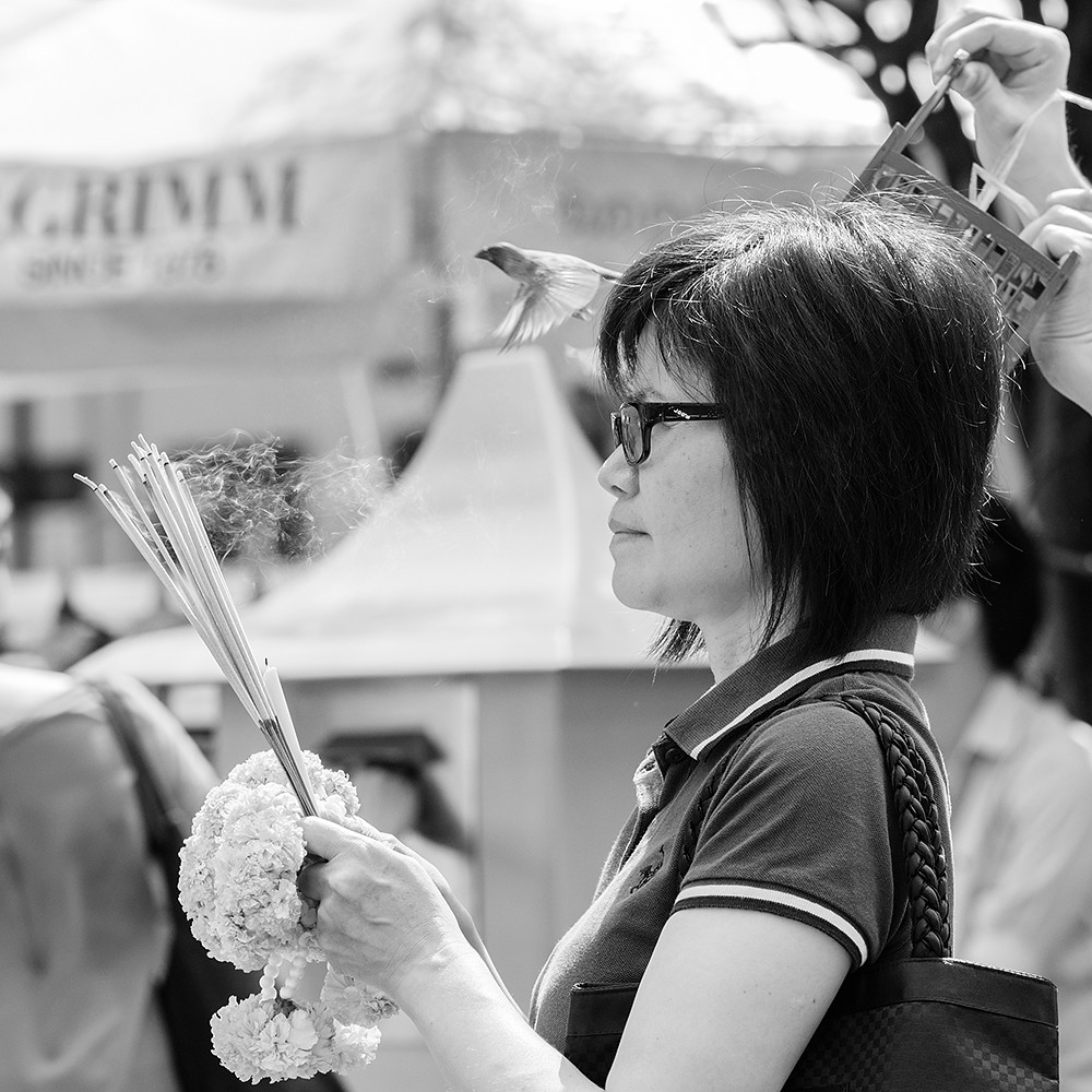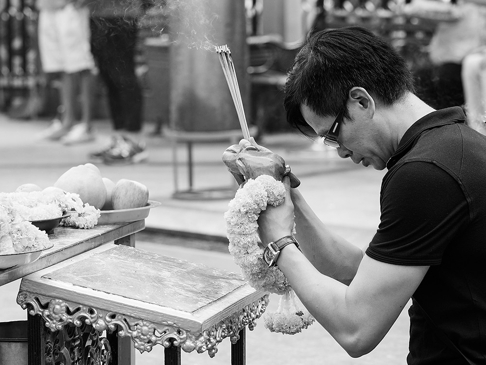 Photographing around the shrine is surprisingly difficult. Because visitors visit all four heads of the Brahma god; there is a constant rotation, and no clear point to get clear shots. Add in the harsh light and the occasionally dense clouds of incense smoke, and I was pleased to grab these, all taken with the E-M5 and the Olympus 75mm: