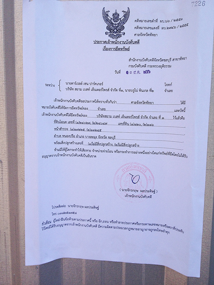 2013-04-19| Pete saysIt is indeed Mr Darryl (Chen) Parker against Siam Best Enterprise (1) and Mr Bruno Pinkel (2). Pattaya court (on 13th March) has forbidden them from doing anything to the land without the court’s permission.