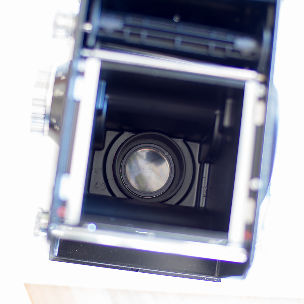 The outside is immaculate, and everything functions as it should, but there is some visible marking on the taking lens, maybe just haze from old age, but also possibly helped by the various fluids that have been squirted onto the shutter to keep it running; Yashica shutters have a tendency to tiredness and need perking up from time to time.