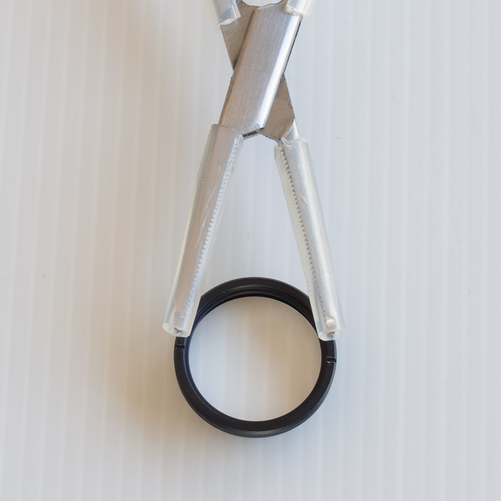 Next I put some rubber tubing on the arms of the hemostat to ensure it would not scratch the body. I also pulled the tubing over the notches, so I could push down on the lens and have the head surrounded by protective rubber.