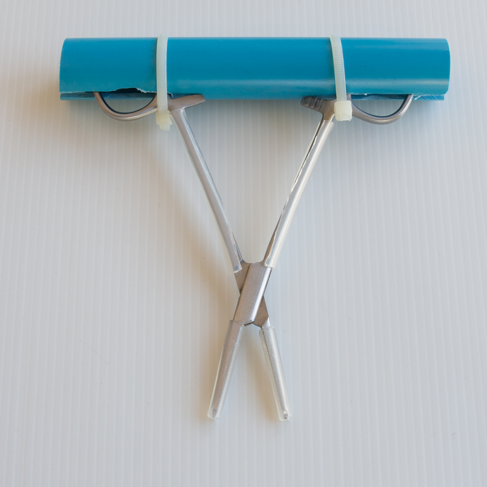 The answer, as with most of my “engineering” solutions, lay in blue plastic plumbing pipe. I cut two slots in the pipe and gradually deepened them until the hemostat was at exactly the right amount of opening. A couple of cable ties made for a solid job.