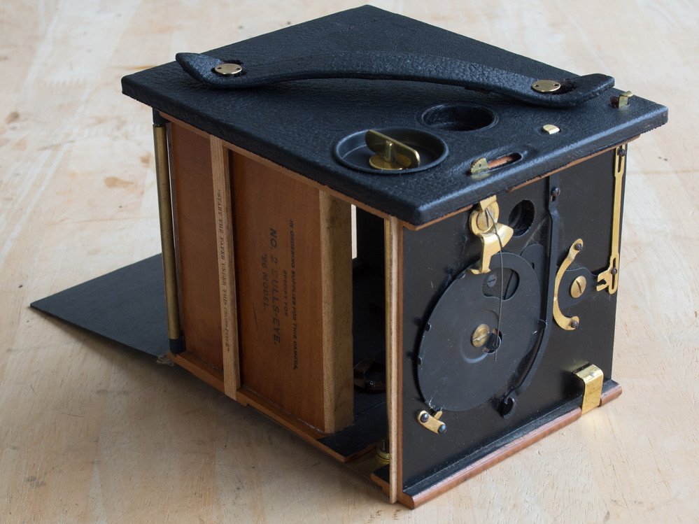 Meanwhile, over in Boston, the imaginatively named Boston Camera Company produced the Bulls-Eye camera (note to genuinej, blame Boston Camera for leaving out the apostrophe). This was the first camera in the world to use a paper backing on the film, on which was written the exposure numbers; and owners could read off the shot number through a little red window in the back of the camera.