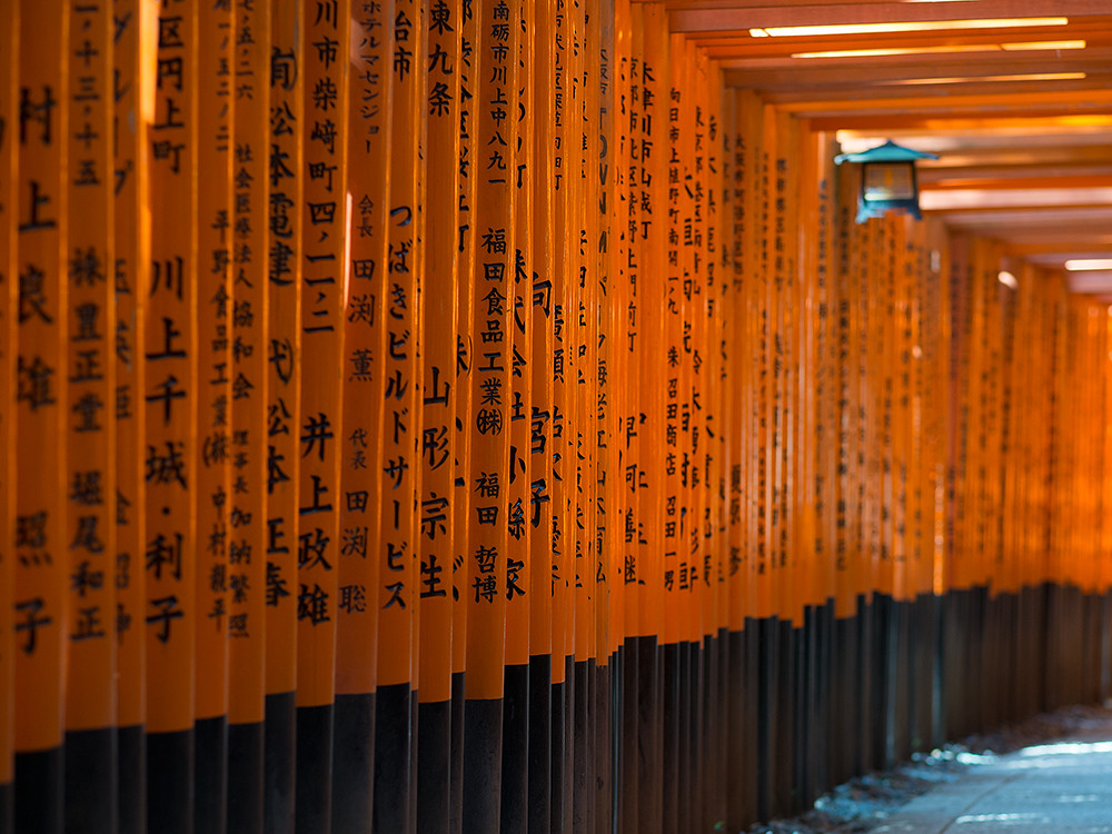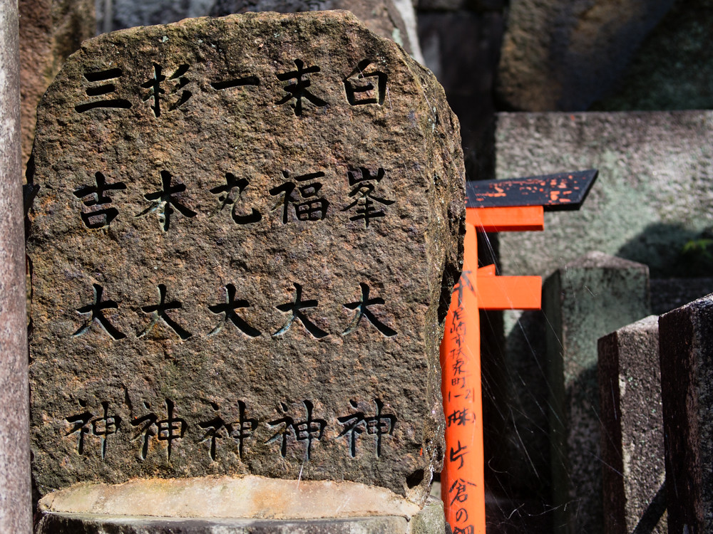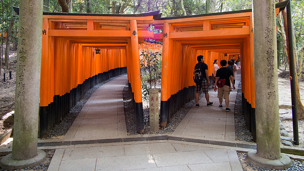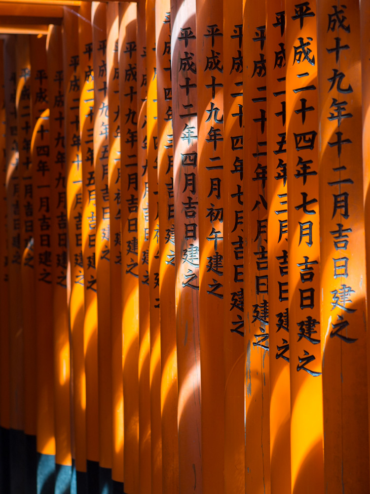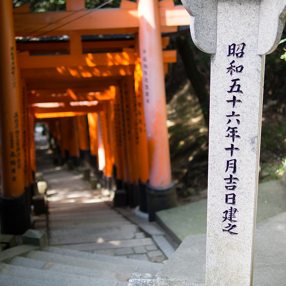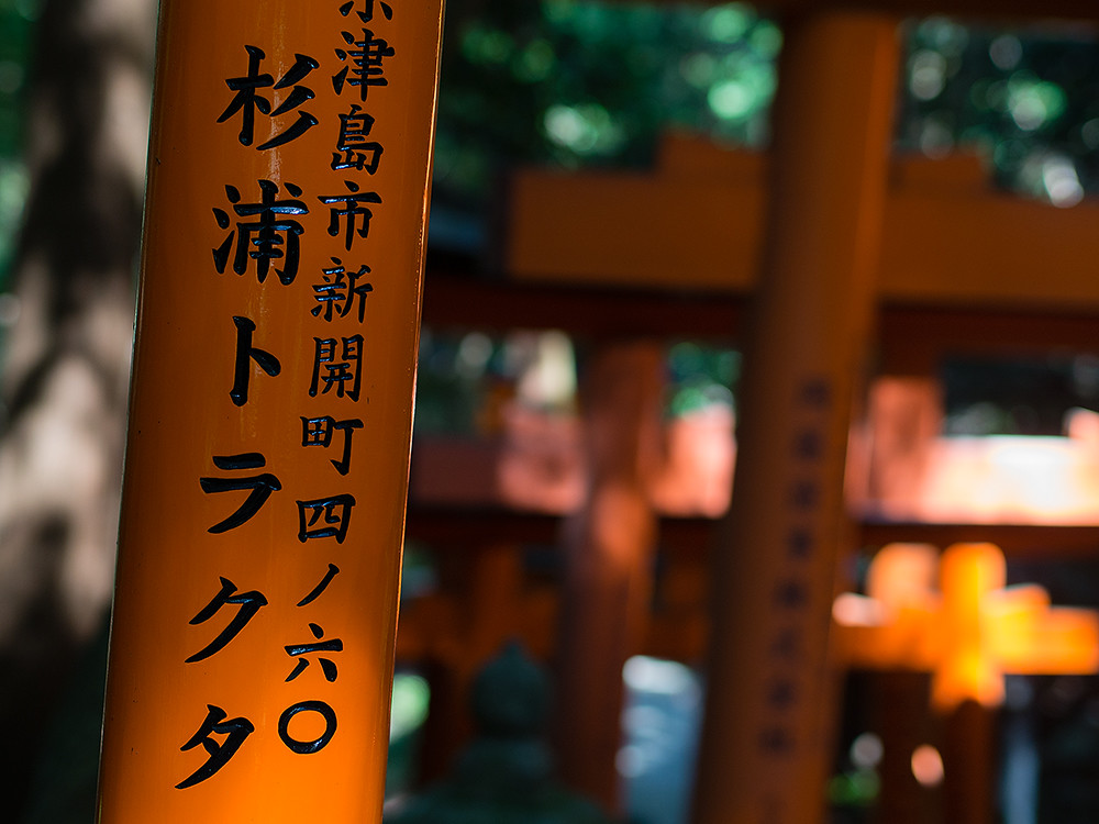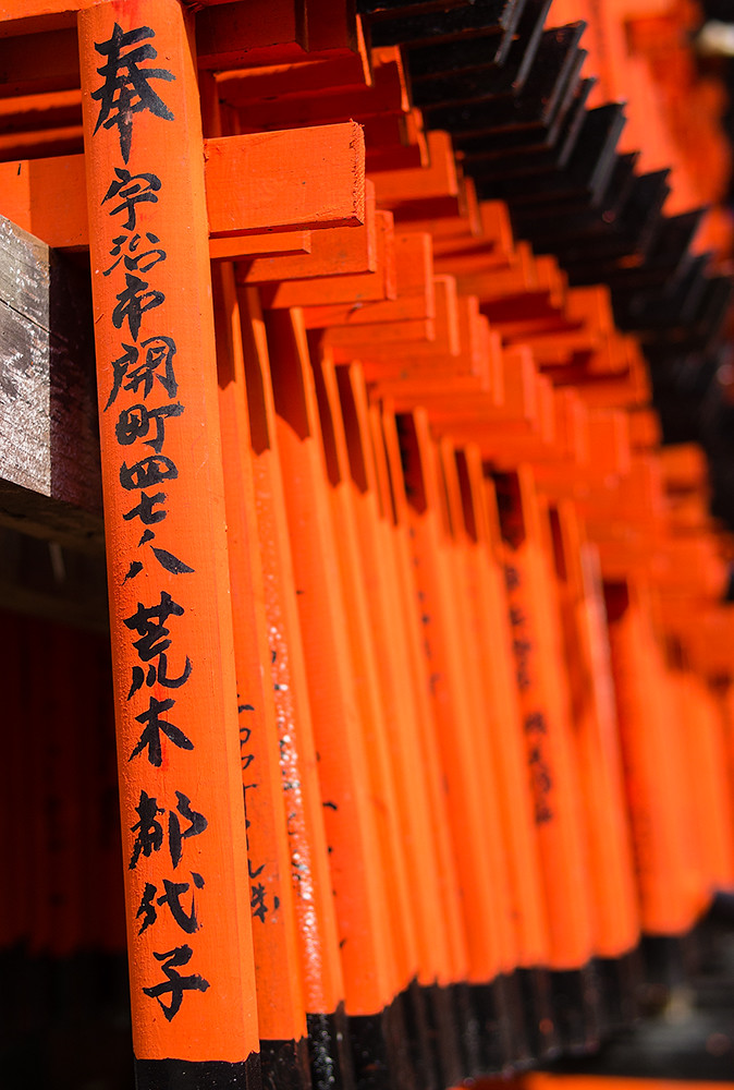 But turn around and look down the trail and you will find that each torii is inscribed with the name of the donor; typically a business. This is because the shrine is dedicated to Inari, the Shinto god of rice and a patron of business.