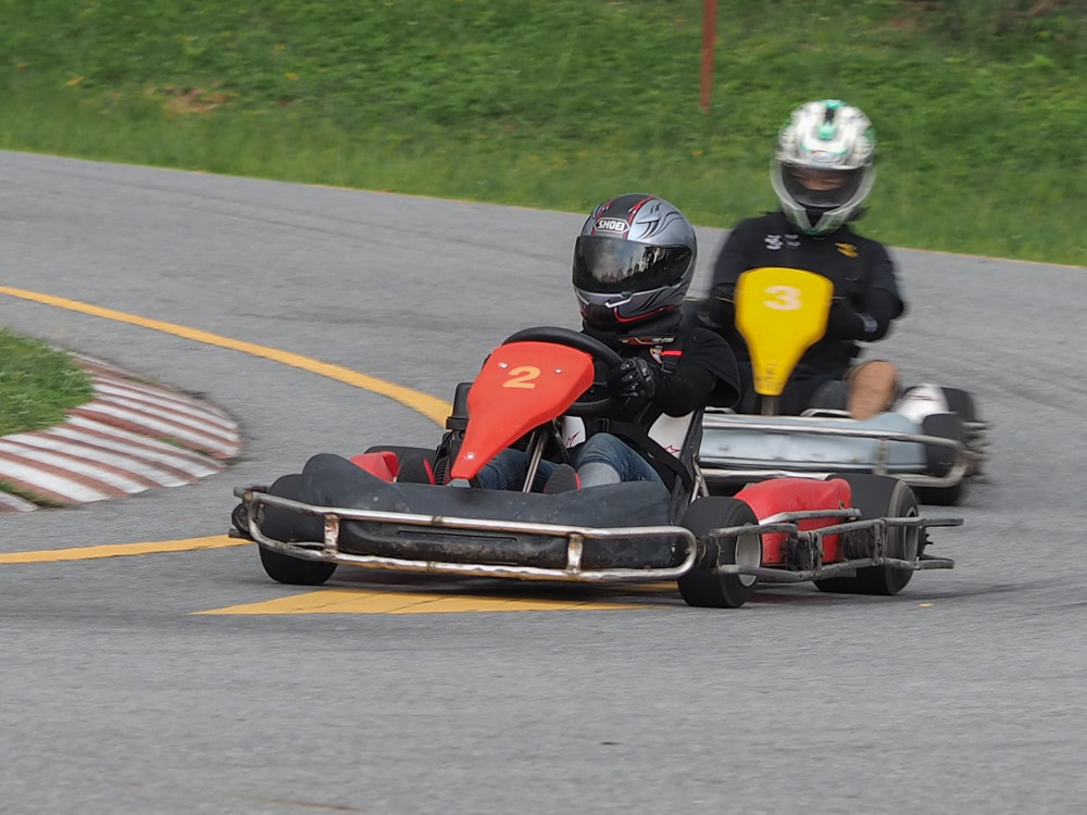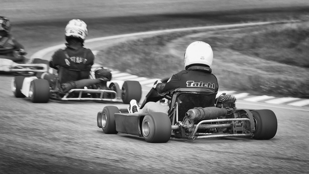 The results were, as expected, not at the level of a Canon 1D. The camera beeps when it has acquired focus, and then beeps again when it thinks it is tracking; this can take longer than you would like if you want an instant shot. Although the camera did pick up the focus after the karts had rushed past my nose and were heading into the first corner, and gave me this shot, quite impressed: