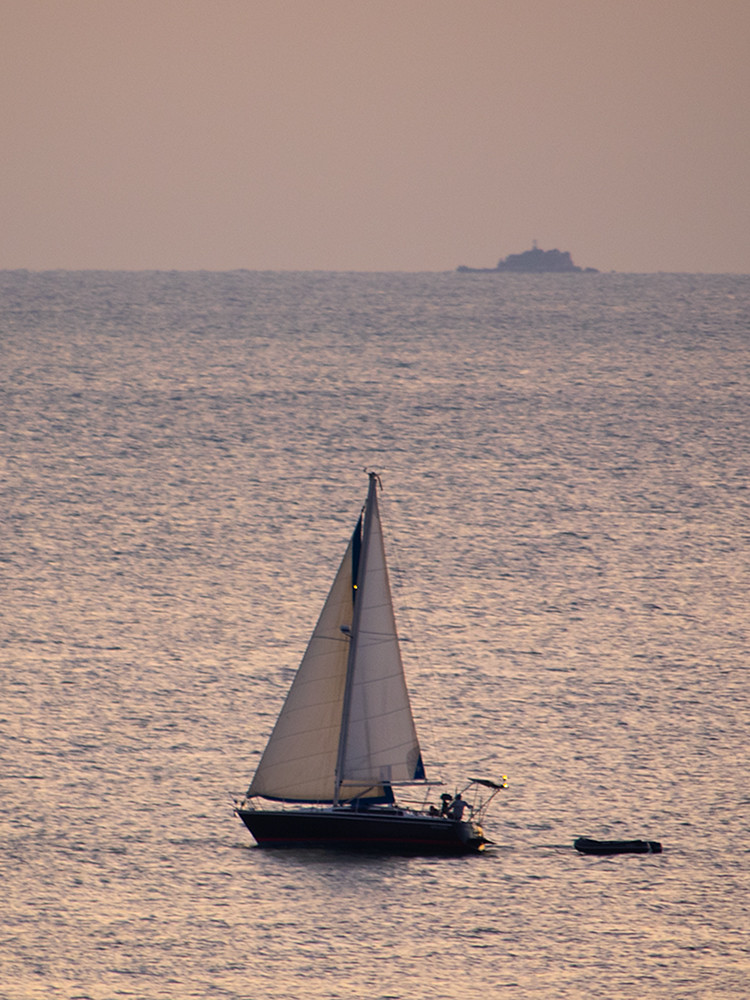 Sun had set and we were left with a dull golden light, and I spotted a yacht out in Pattaya bay. Stuck the Panasonic 100-300mm and took a shot at 250mm; 1/25th second.