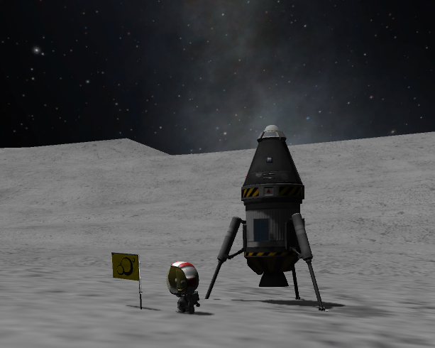 Fortunately I had by this time discovered the quick save key; which meant I was able to save my position during the descent to the surface and make several attempts at the landing; those Apollo guys deserve some respect. But finally, landing! And a flag!!
