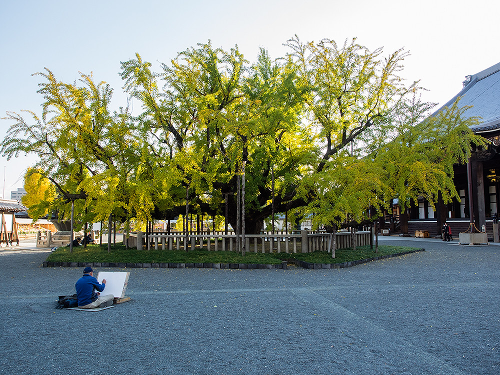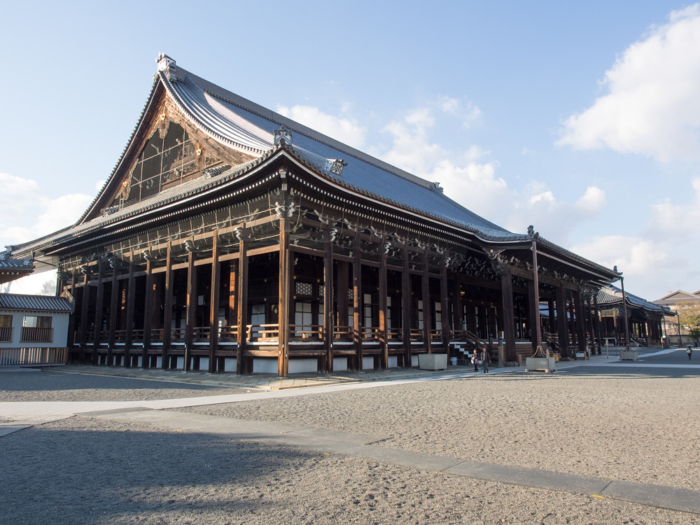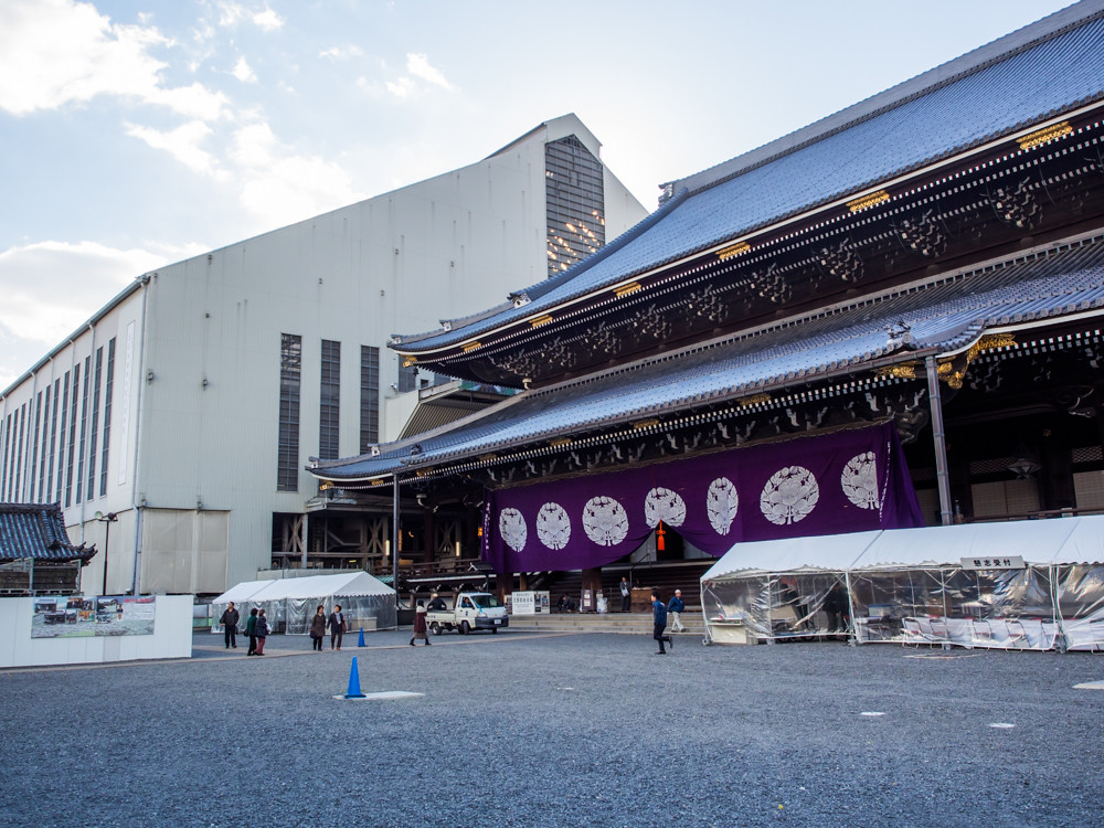 My first stop was Higashi Honganji where one of the halls was undergoing substantial renovation. Renovate a temple in Thailand and you throw up some wooden scaffolding; but in Japan such efforts dictate the enveloping of the building inside a massive warehouse: