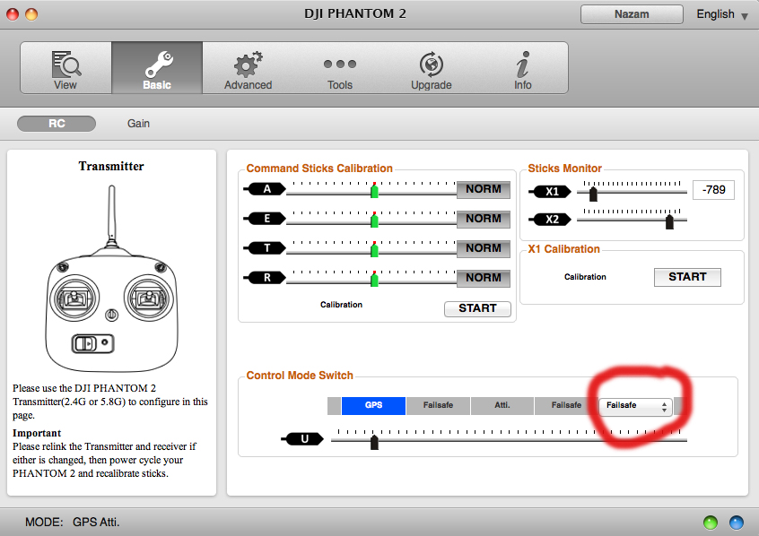 Make sure you have selected Failsafe; which triggers the Return To Home mode. Another option is Manual, which removes all the limits of the flight system and allows advanced pilots to perform rolls and other aerobatics, and pilots like me to convert my Phantom to a pile of plastic in a couple of seconds. You probably don’t want to try Manual mode.