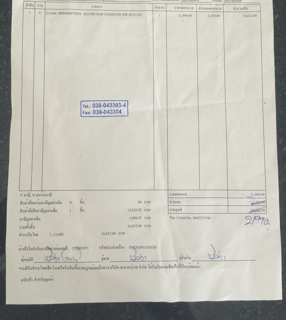 I entered the store shortly after opening and attracted the attention of a young salesman. I pointed to the soundbar and told him I wanted one. He confirmed there was one in stock and off we went to the cashier area. He brought out the rather substantial box and I gave him 22,000 baht. He disappeared, although not to the usual cashier, and came back with my change.