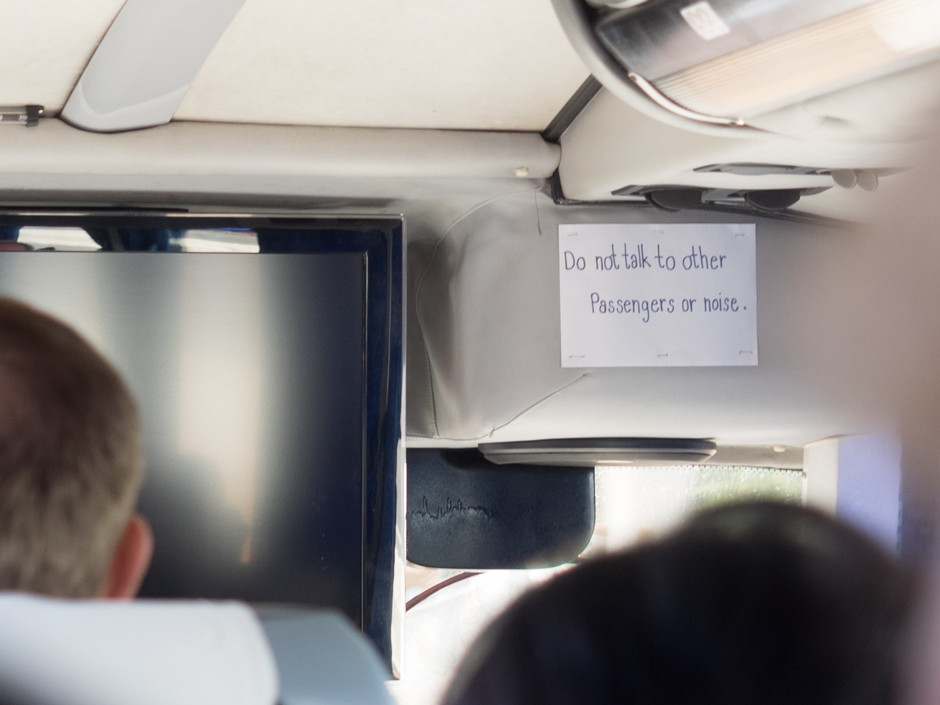 Outfit acquired, it was off to the airport on Tuesday. A sign in the bus ensured a peaceful trip.