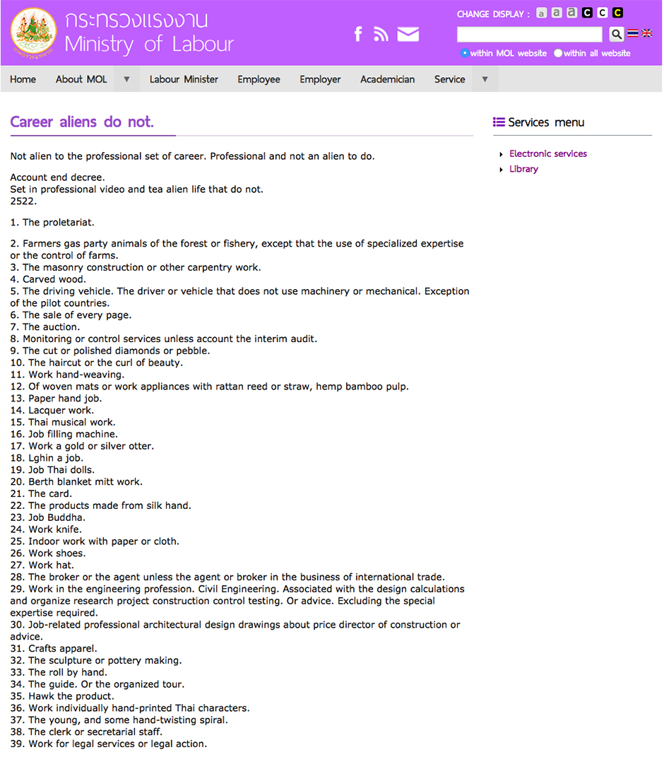 2015-08-13| ChristianPFC saysA very poor translation of a list of professions which are prohibited for foreigners. Professional translations can be found on the internet.